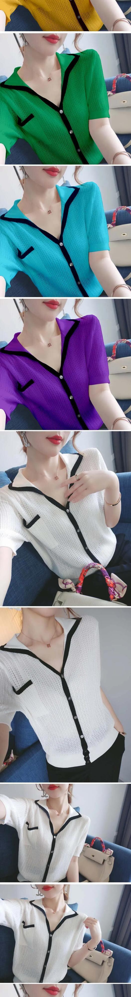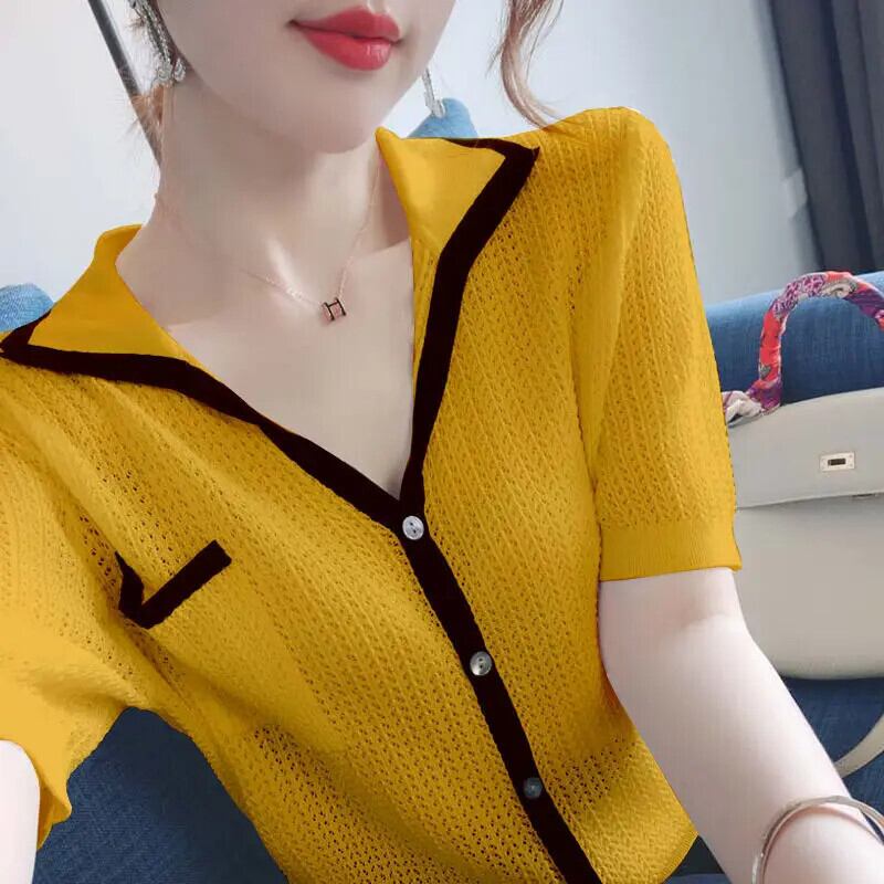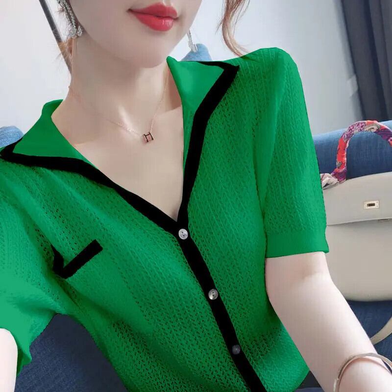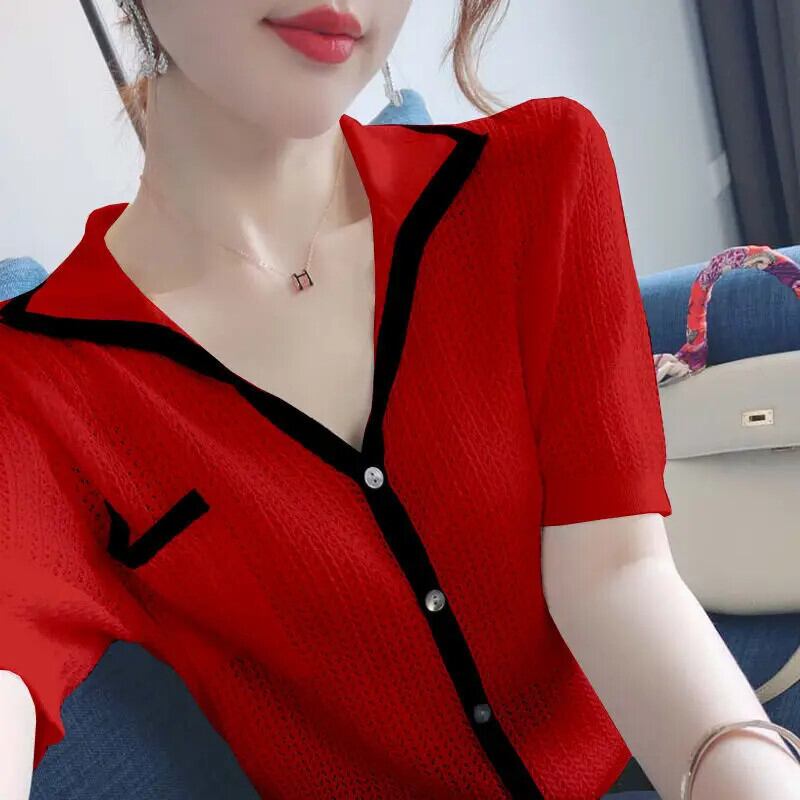 送料無料 V ネック半袖スプライシング中空アウトボタンルーズシャツ夏の通勤トップス特大女性ブラウス ショート ハーフスリーブ サマー 夏物 Vネック AE1288776698950938448