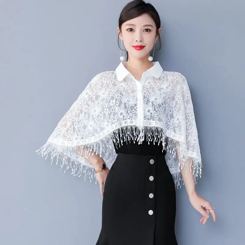 送料無料 ラペルスプライシング不規則な中空アウトテルレースシャツ女性の 2023 夏トップス非対称ブラウス サマー 夏物 AE1288776699402588984