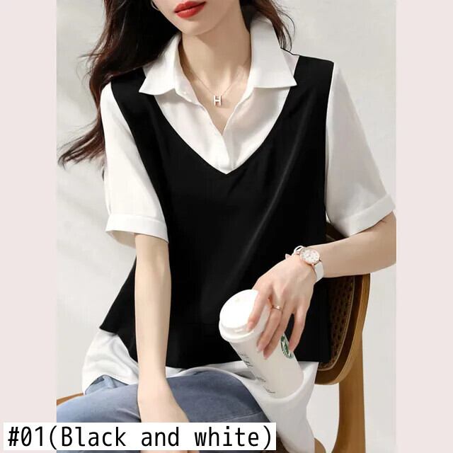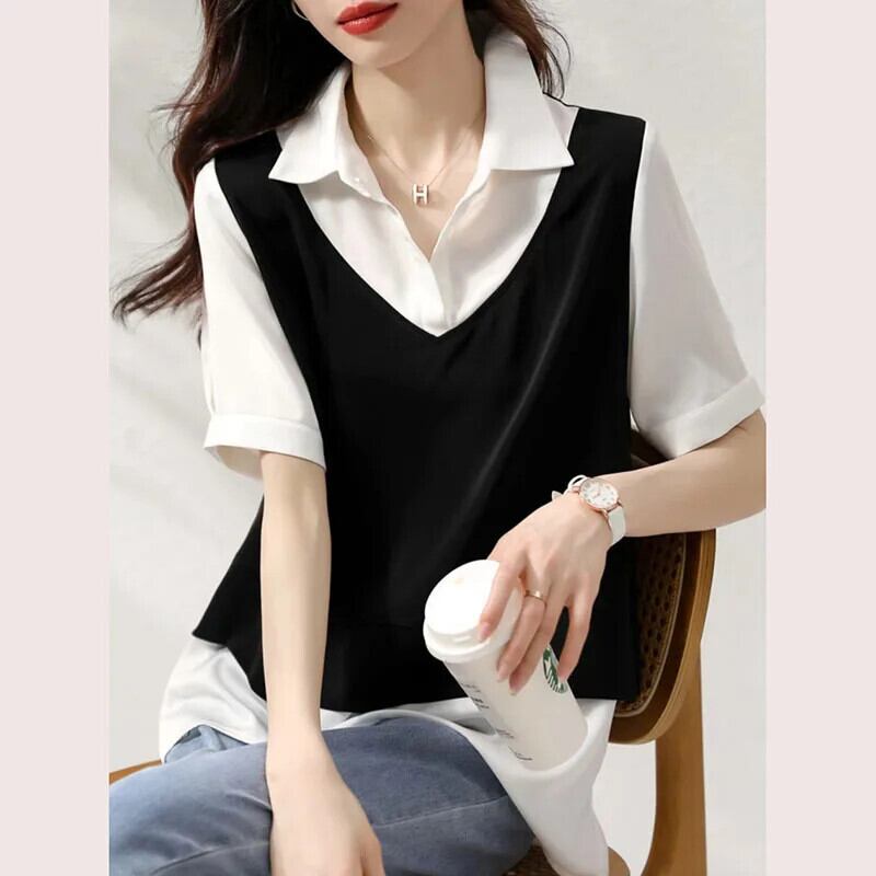 送料無料 ラペルスプライシング不規則なフェイクツーピースブラウス女性の 2023 夏特大トップス非対称シャツ サマー 夏物 AE128877663084167420