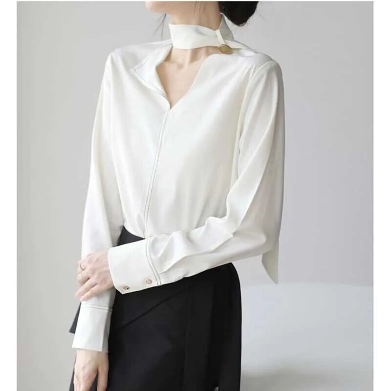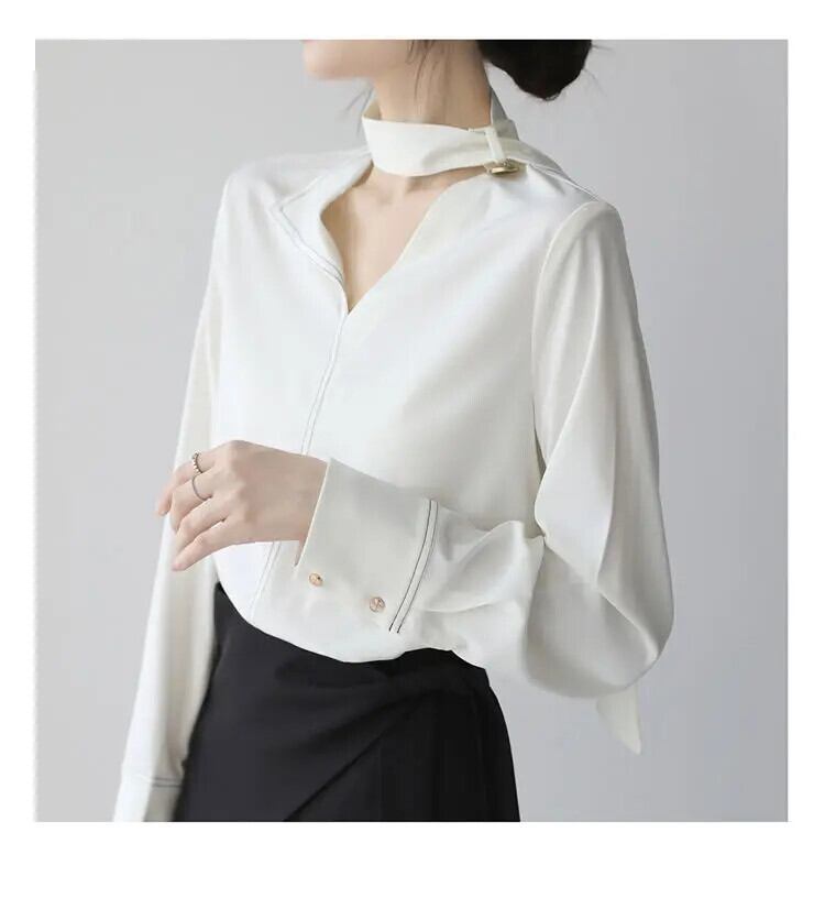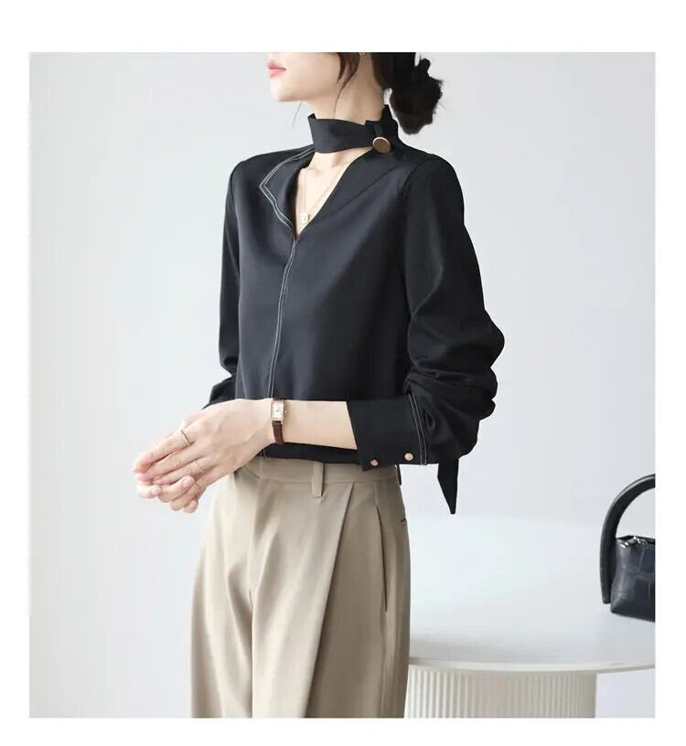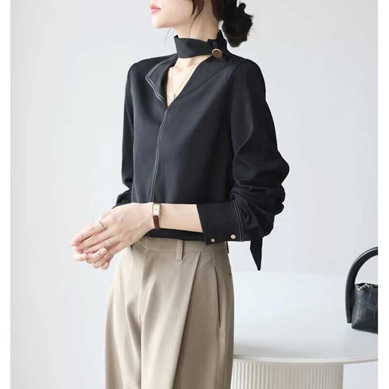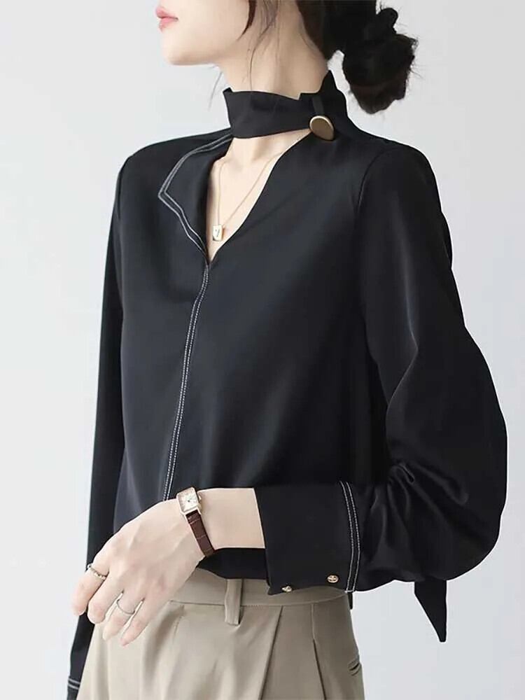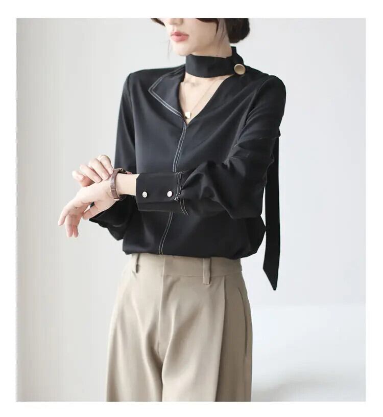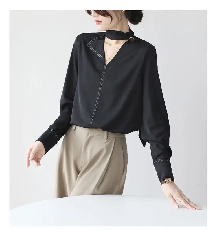 送料無料 V ネックソリッドカラーレースアップ非対称ブラウス女性の 2024 春ルーズオールマッチトップスオフィスレディシャツ スプリング 春物 Vネック 会社 学校 通勤や通学にも AE1288776654187125526