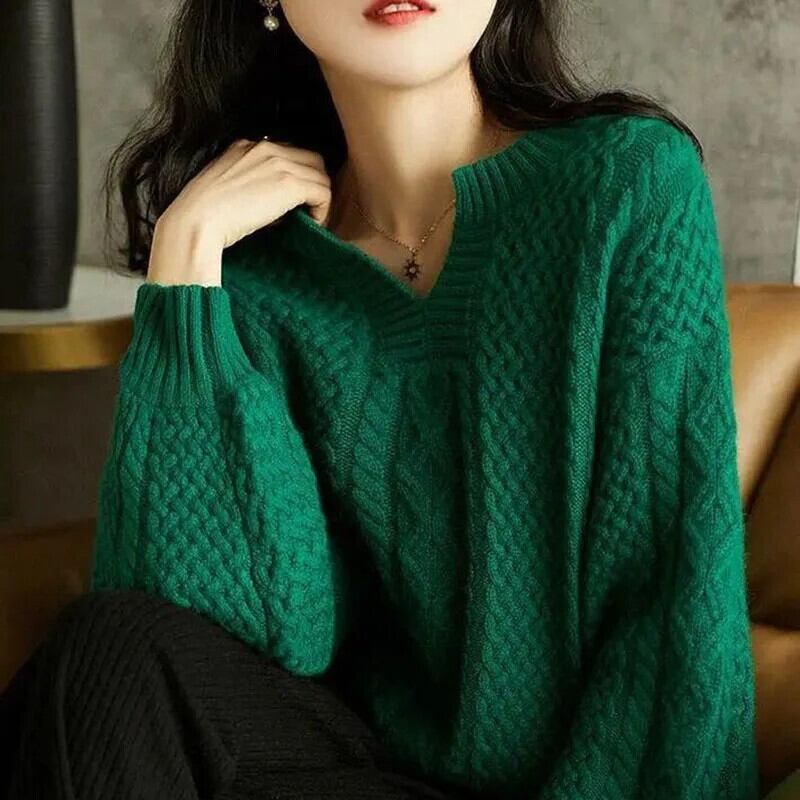 送料無料 スタイリッシュな V ネックソリッドカラーニットねじ糸セーター女性の 2022 秋ルーズプルオーバー暖かいトップス オータム 秋物 Vネック AE128877662318107110