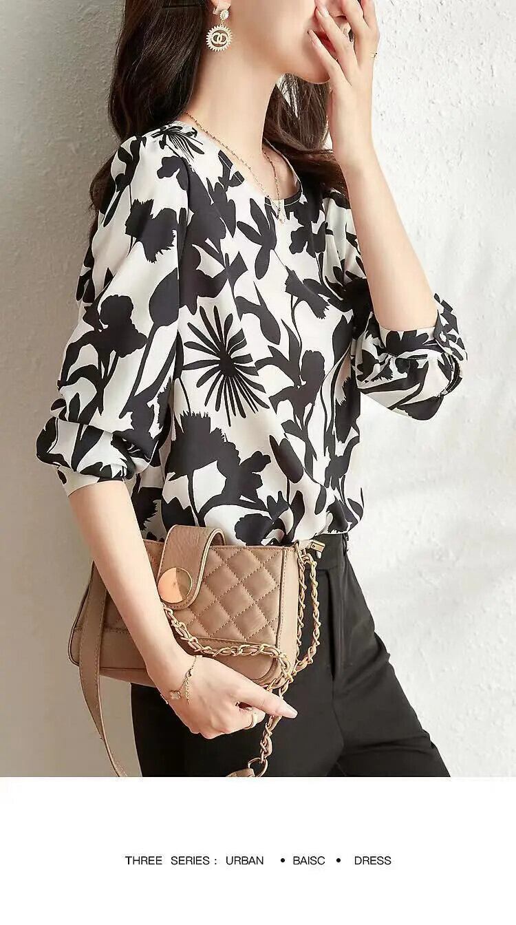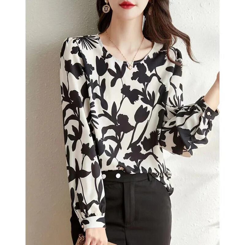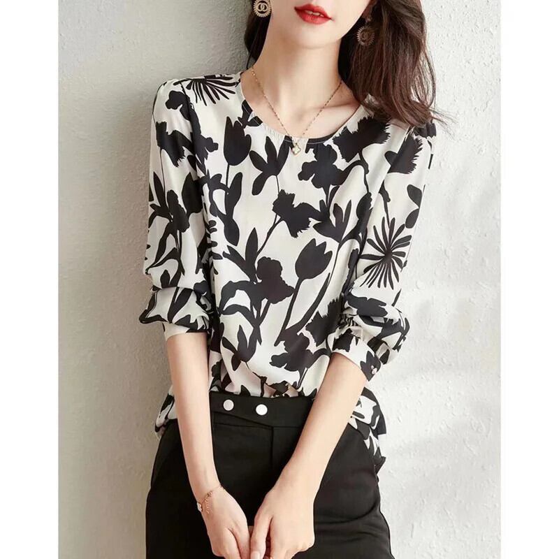 送料無料 ヴィンテージプリント O ネック特大シフォンシャツ 2022 夏と秋プルオーバールーズ通勤女性のブラウス サマー 夏物 オータム 秋物 Oネック ビンテージ AE1288776637436211899