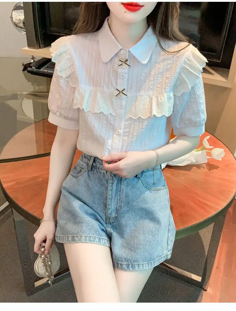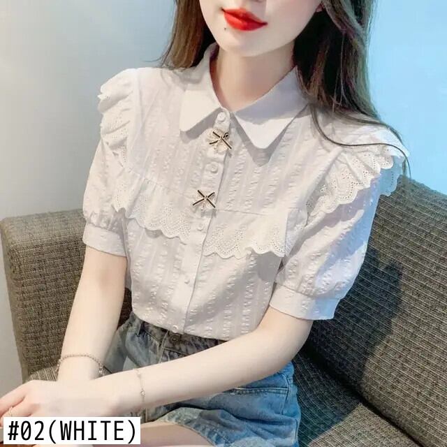 送料無料 ラペル無地スプライシング弓レースフリルシャツ女性 2024 夏ルーズトップス甘いブラウス リボン ラッフル 大人ガーリー スウィート キュート カジュアル サマー 夏物 ソリッドカラー AE1288776625163679905