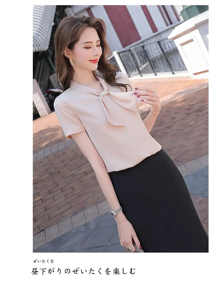 送料無料 半袖特大 V ネック弓シフォンシャツ夏ルーズ女性のブラウス通勤プルオーバーブラウス 5XL ショート リボン ハーフスリーブ サマー 夏物 Vネック AE128877665119034397