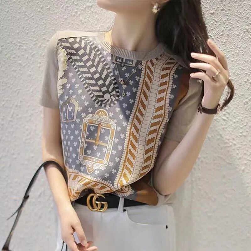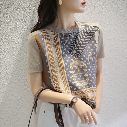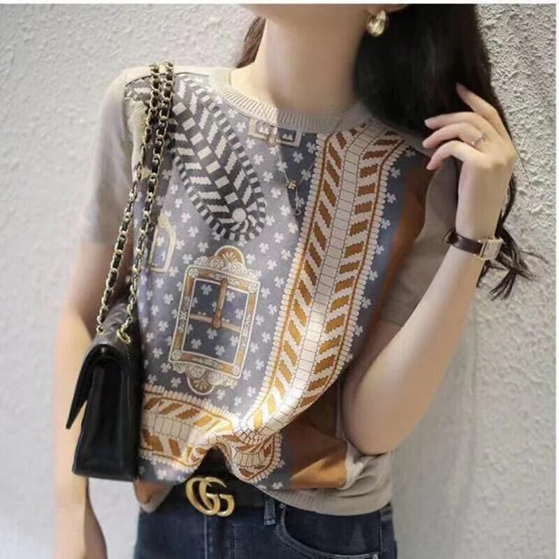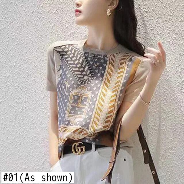 送料無料 ヴィンテージプリント O ネックニットスプライスブラウス女性の 2024 半袖プルオーバートップスオールマッチ通勤シャツ ショート ハーフスリーブ Oネック ビンテージ AE1288776631875915163