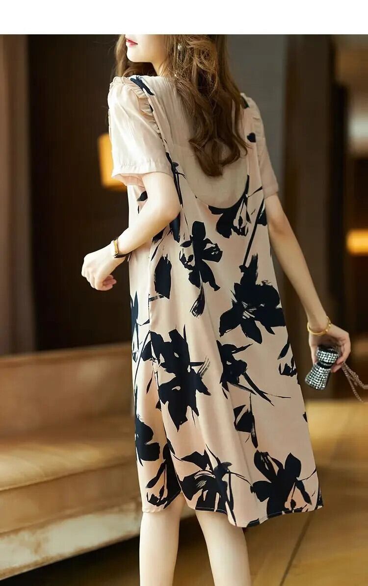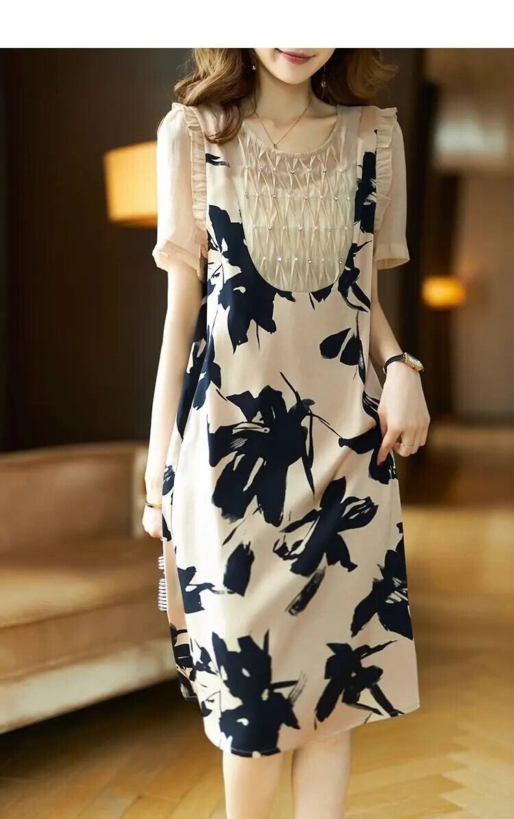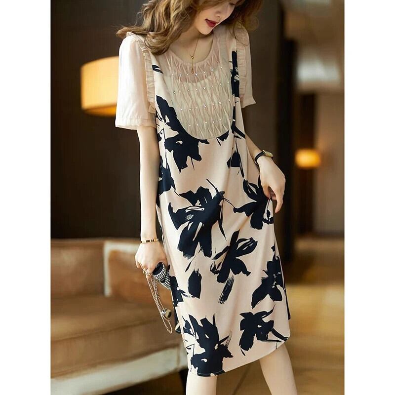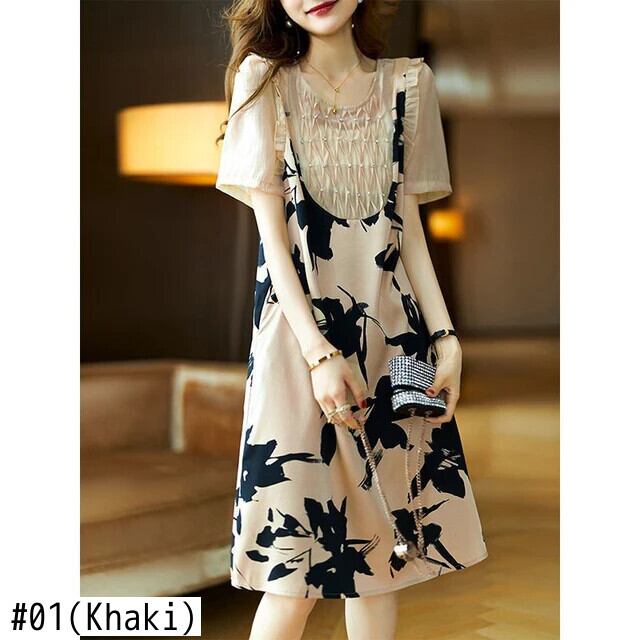 送料無料 ひだダイヤモンドビーズフェイクツーピース花柄ドレス女性の 2024 夏ルーズパフスリーブドレス サマー 夏物 AE1288776661536210639