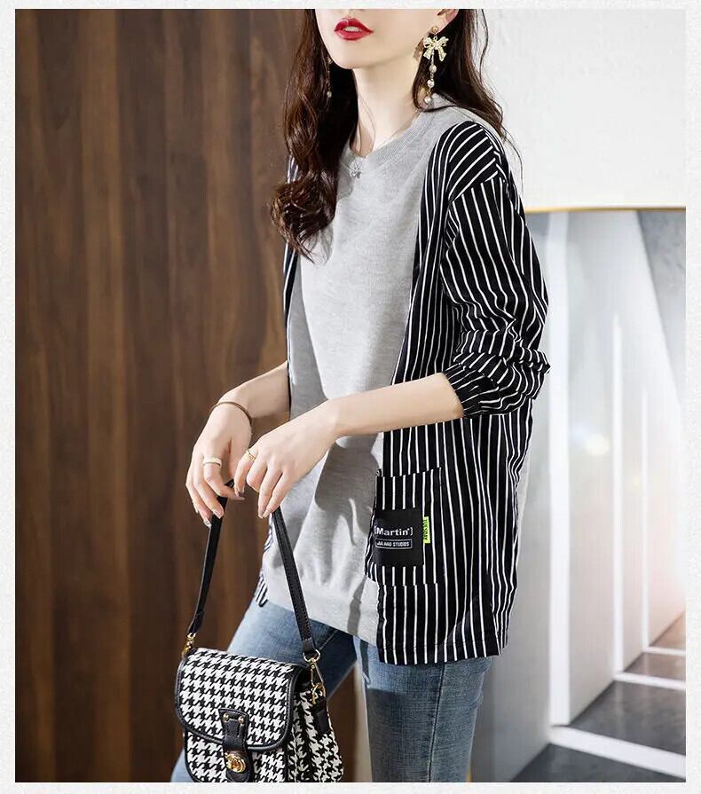 送料無料 スタイリッシュな O ネックスプライスポケットストライプブラウス女性の 2022 秋ルーズプルオーバーオールマッチシャツ オータム 秋物 Oネック AE1288776637154550112