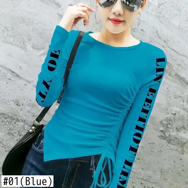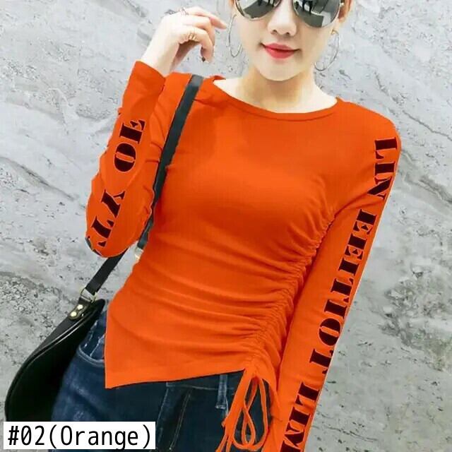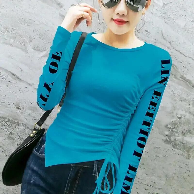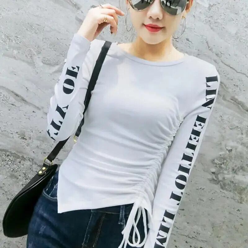 送料無料 O ネックプリントレターシャーリング包帯ブラウス女性の 2023 秋冬スリムトップス非対称シャツ オータム 秋物 ウィンター 冬物 Oネック AE1288776698842908296