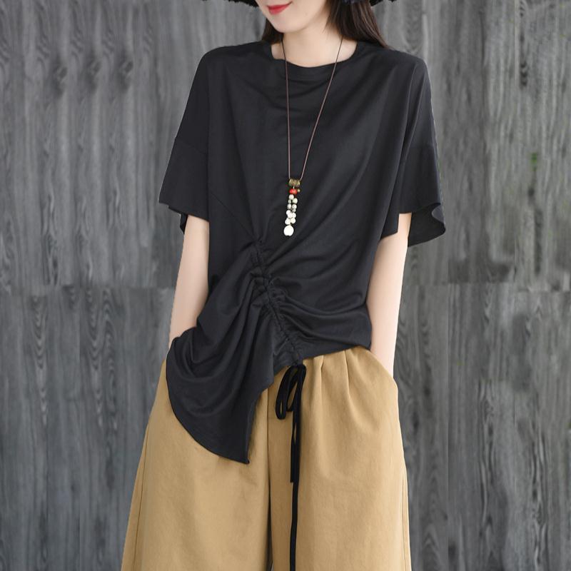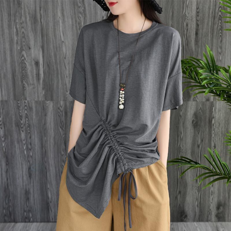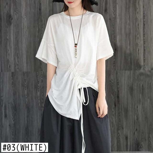 送料無料 スタイリッシュなソリッドカラー包帯弓シャーリング不規則なブラウス女性の 2023 夏プルオーバー非対称シャツ リボン サマー 夏物 AE1288776665079336385