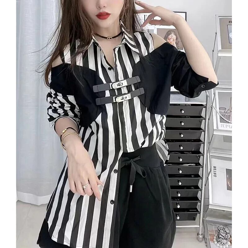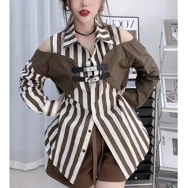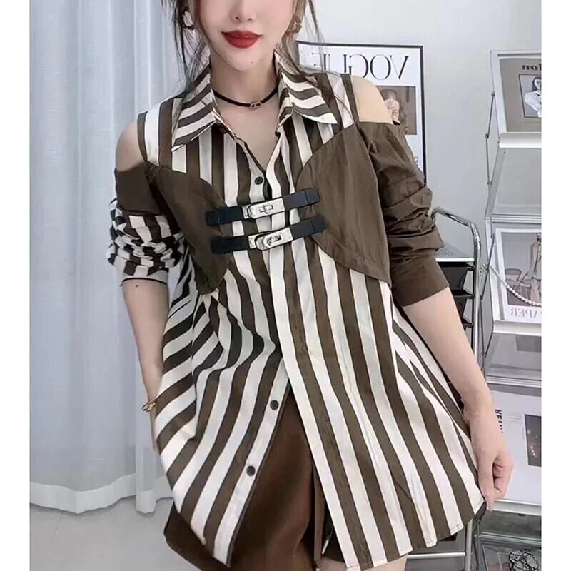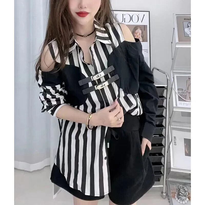 送料無料 スタイリッシュなラペルボタンスプライスオフショルダーストライプシャツ 2023 秋ルーズトップスフェイクツーピースブラウス オータム 秋物 AE1288776679684199652