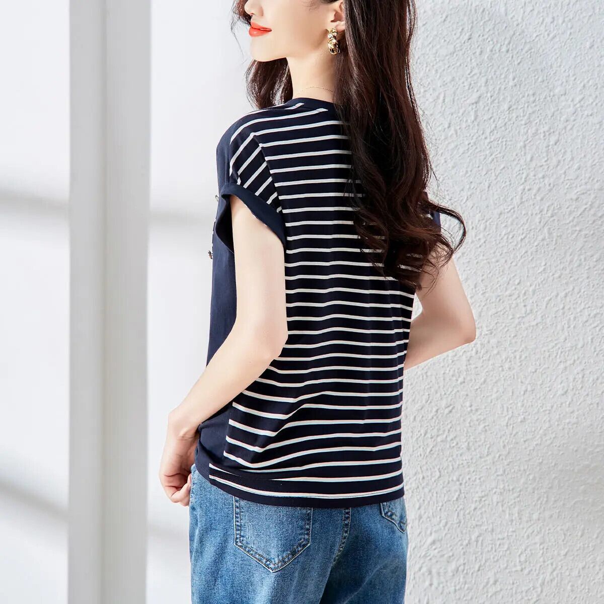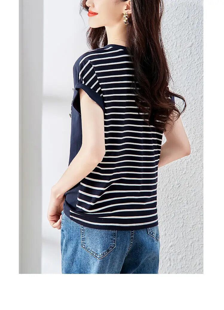 送料無料 ストリップスプライスボタンブラウス女性 2022 夏通勤オールマッチバットウィング半袖 O ネックトップシャツ ショート ハーフスリーブ サマー 夏物 Oネック AE1288776692190820025