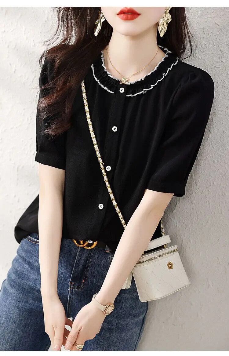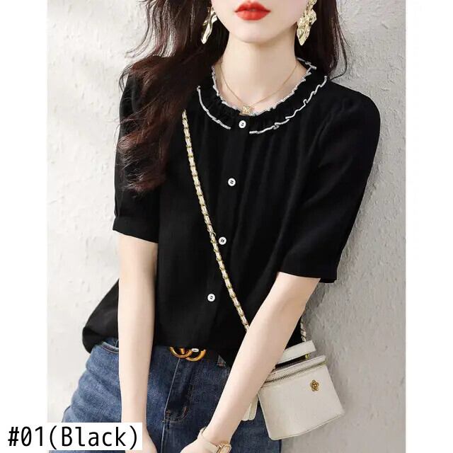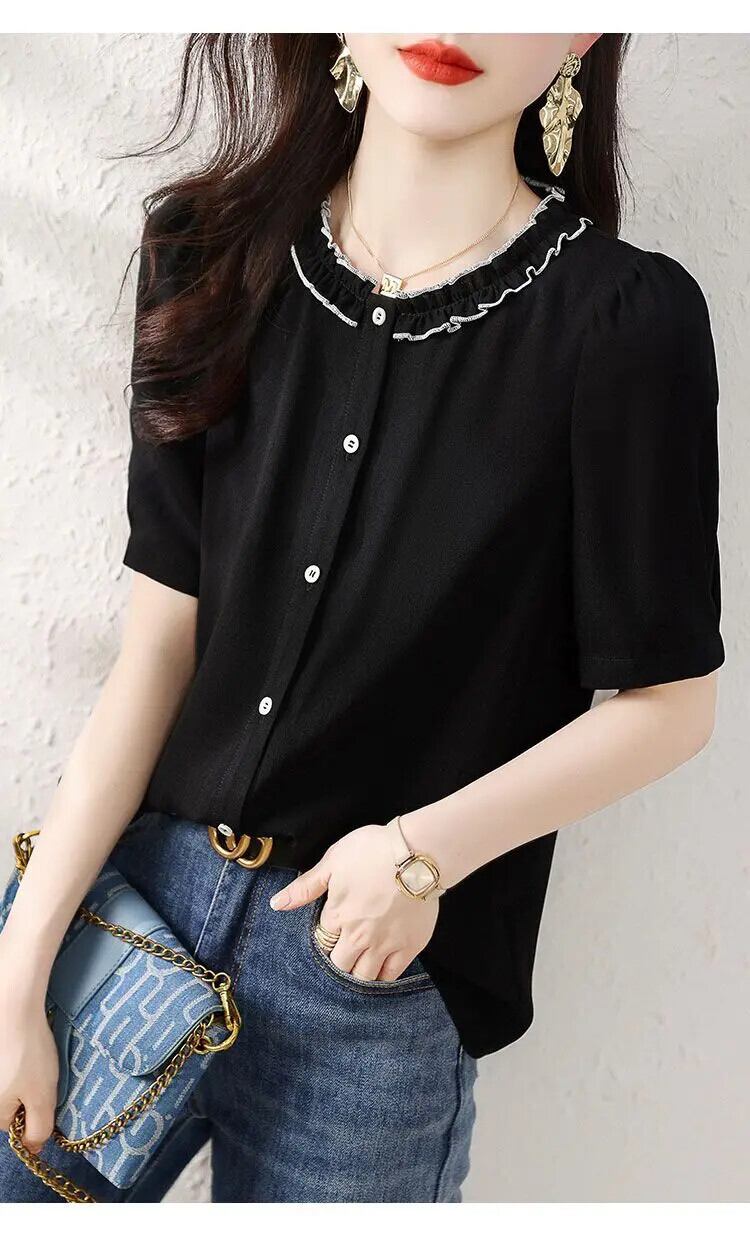 送料無料 O ネックスプライスボタンルーズ半袖フリルシャツ女性の 2023 夏トップスオールマッチブラウス ショート ハーフスリーブ ラッフル サマー 夏物 Oネック AE1288776656845917870