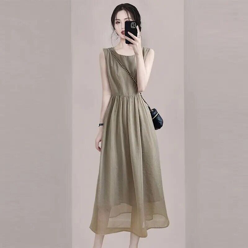 送料無料 O ネックオールマッチシャーリングソリッドカラーノースリーブドレス女性の 2024 夏ルーズオフィスレディミディドレス サマー 夏物 Oネック 会社 学校 通勤や通学にも AE1288776674889085188