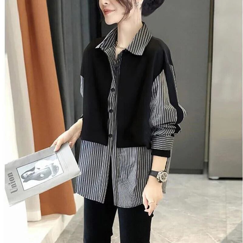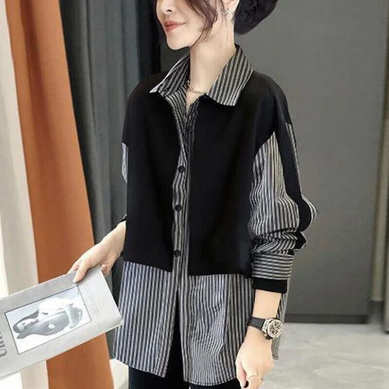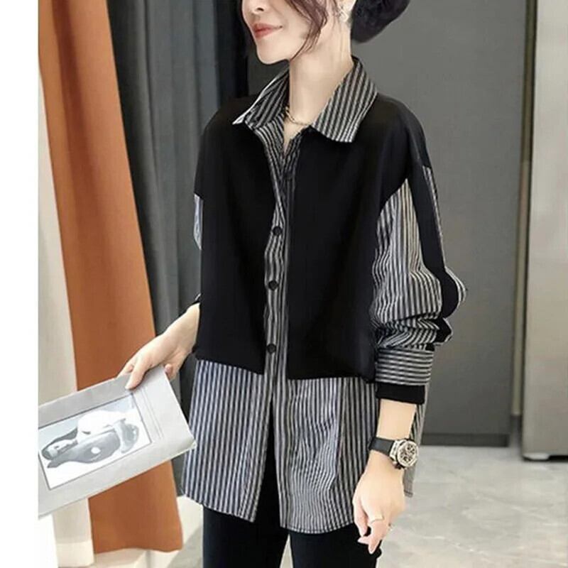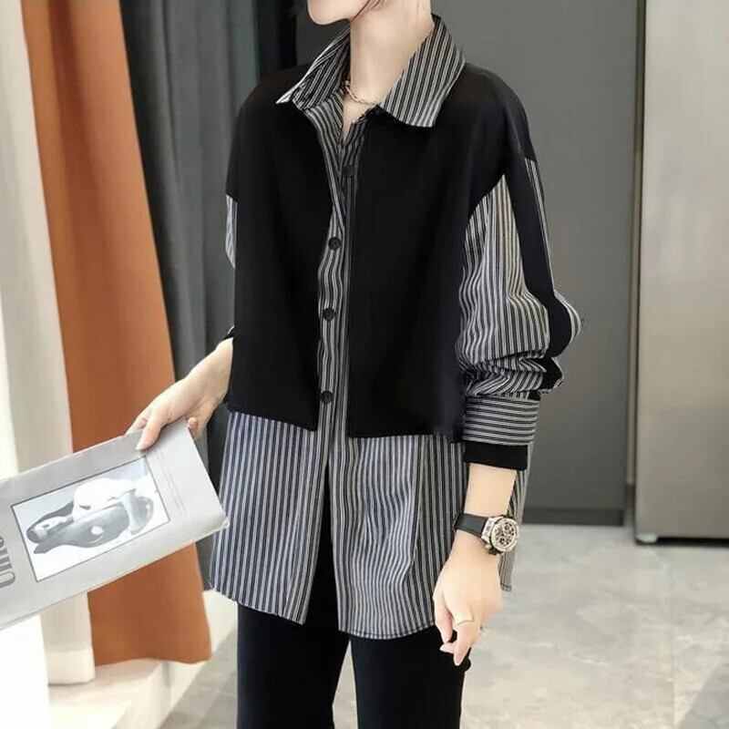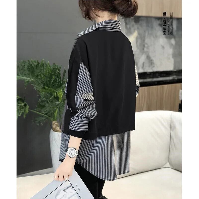 送料無料 ラペルスプライスルーズフェイクツーピースストライプシャツ2023秋トップスオールマッチ通勤ブラウス オータム 秋物 AE1288776696717094312