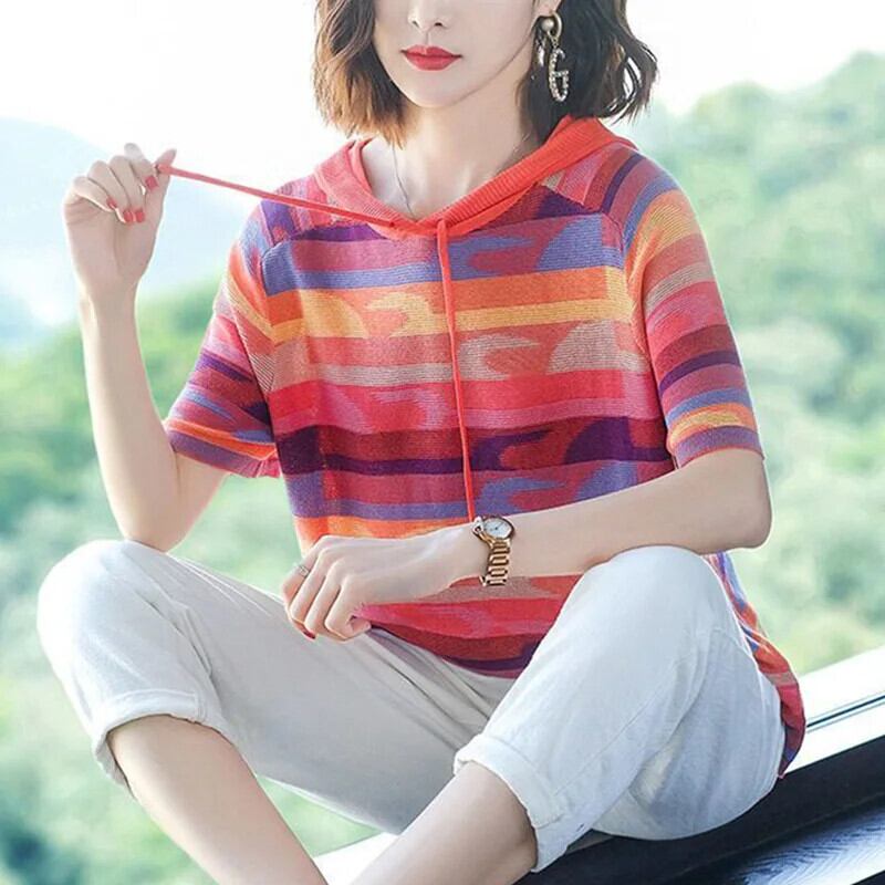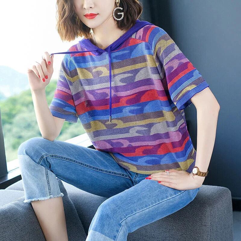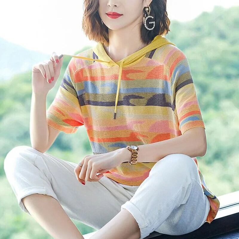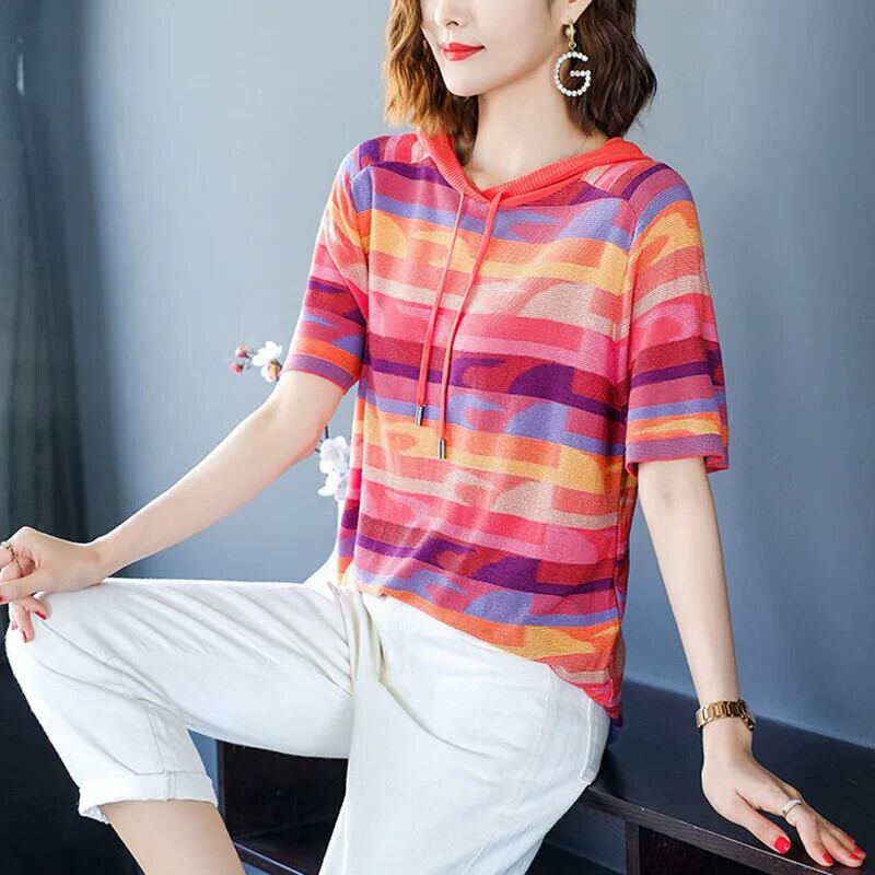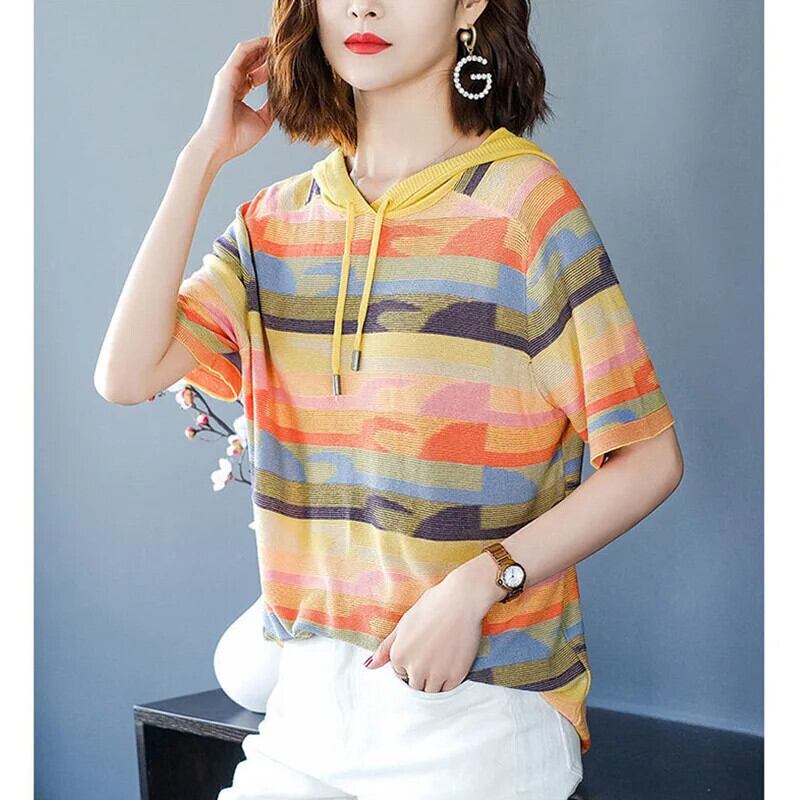 送料無料 フード付きスプライスオールマッチプリントブラウス女性の 2023 夏特大プルオーバールーズ通勤シャツ サマー 夏物 AE1288776618288175016