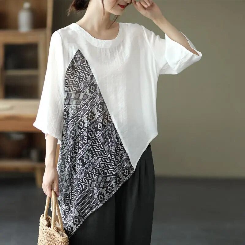 送料無料 プリント O ネックスプライシング不規則なブラウス女性の 2023 春プルオーバールーズ非対称シャツ スプリング 春物 Oネック AE128877668698057555