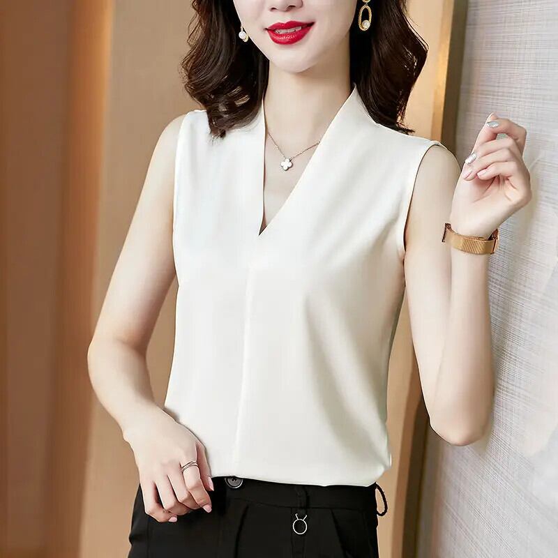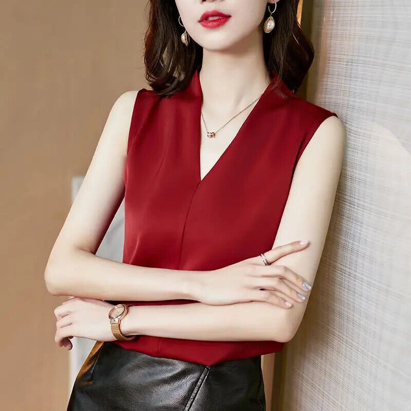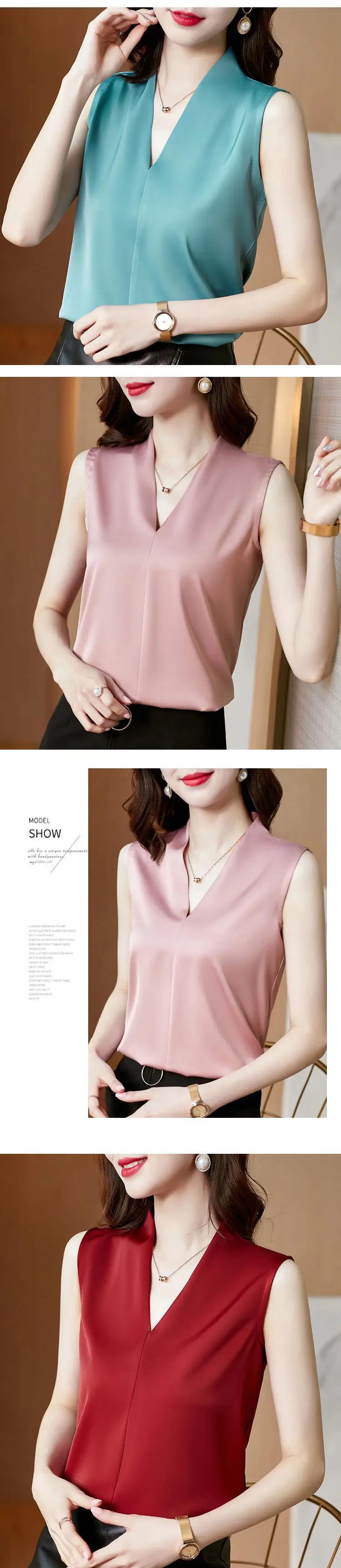 送料無料 V ネックソリッドカラースプライシングノースリーブ特大サテンシャツルーズオフィスレディトップス女性ブラウス 2022 Vネック 会社 学校 通勤や通学にも AE1288776665756638031