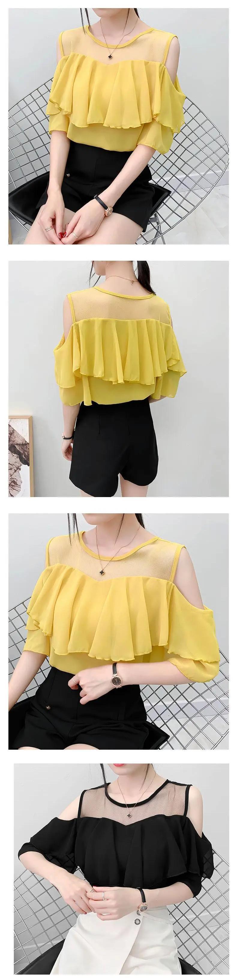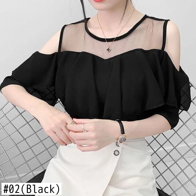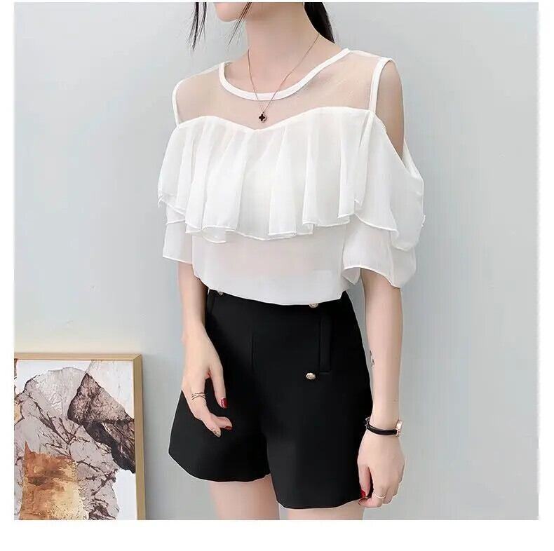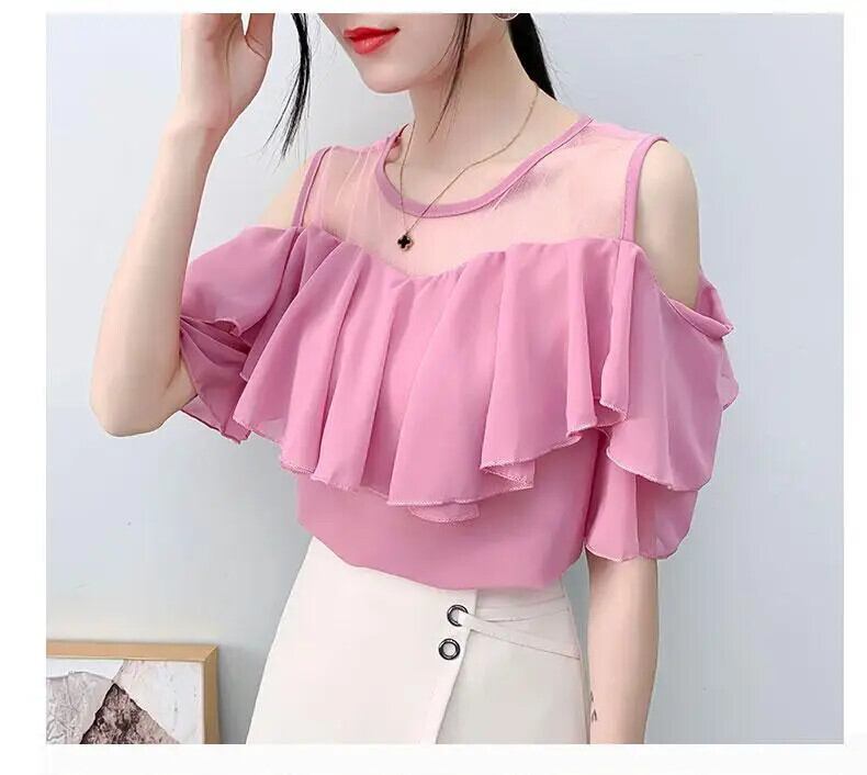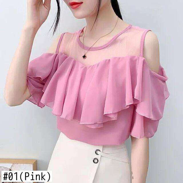送料無料 O ネックガーゼスプライシングフリル半袖シフォンブラウスルーズ通勤女性プラスサイズ無地甘いシャツ ショート ハーフスリーブ ラッフル 大きめサイズ 大人ガーリー スウィート キュート カジュアル Oネック ソリッドカラー AE1288776636270859710