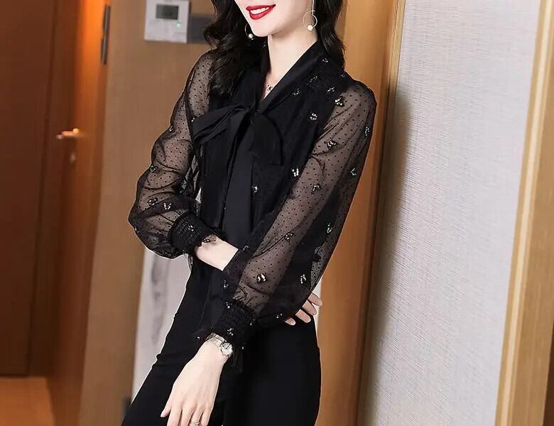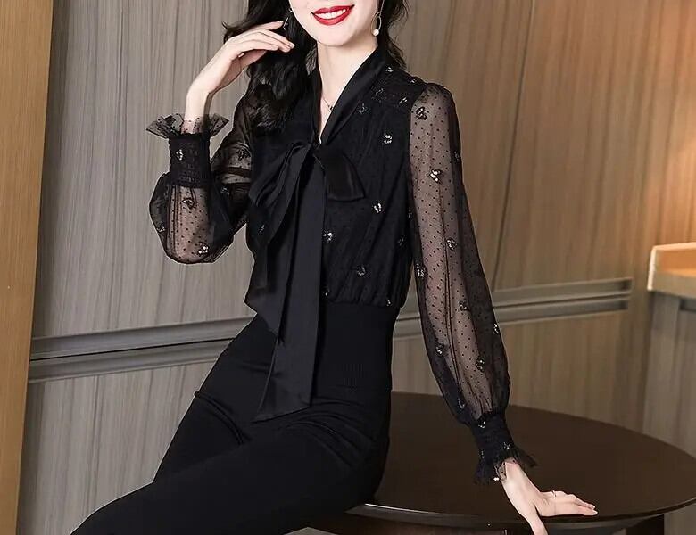 送料無料 V ネック刺繍ガーゼレースアップボウブラウス女性の 2023 秋冬オフィスレディトップス袖シャツ リボン オータム 秋物 ウィンター 冬物 Vネック 会社 学校 通勤や通学にも AE1288776673905803306
