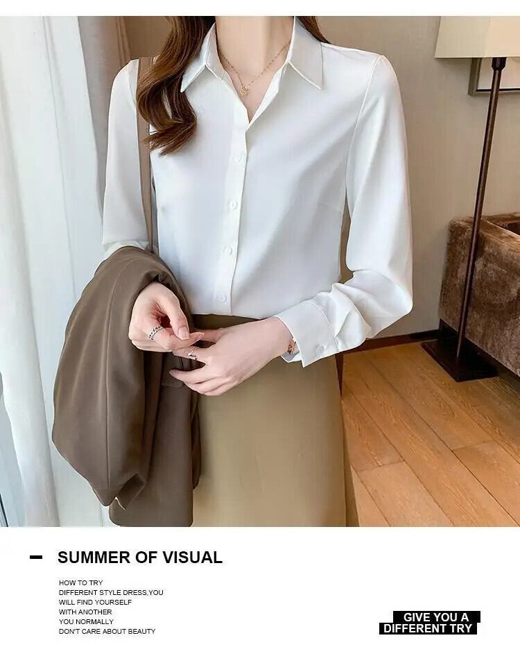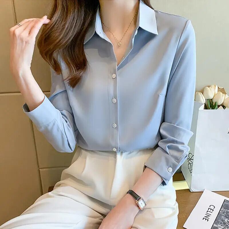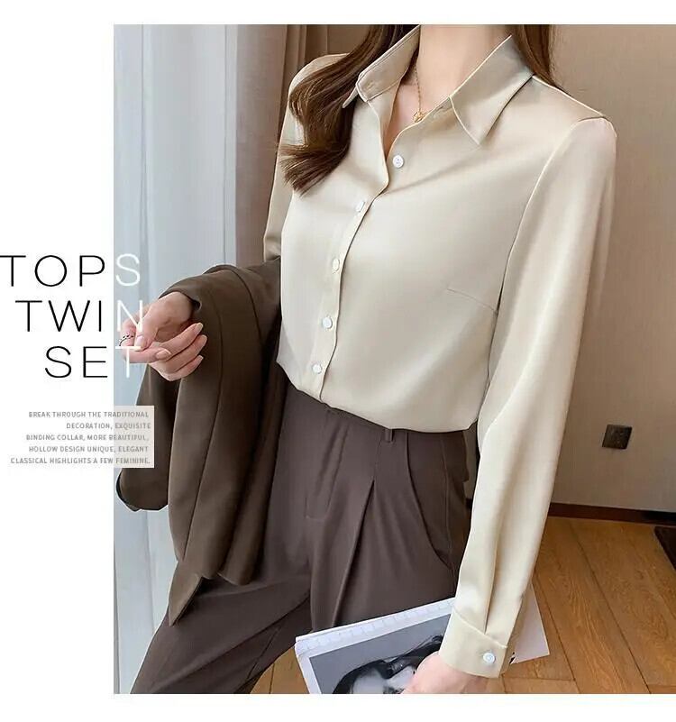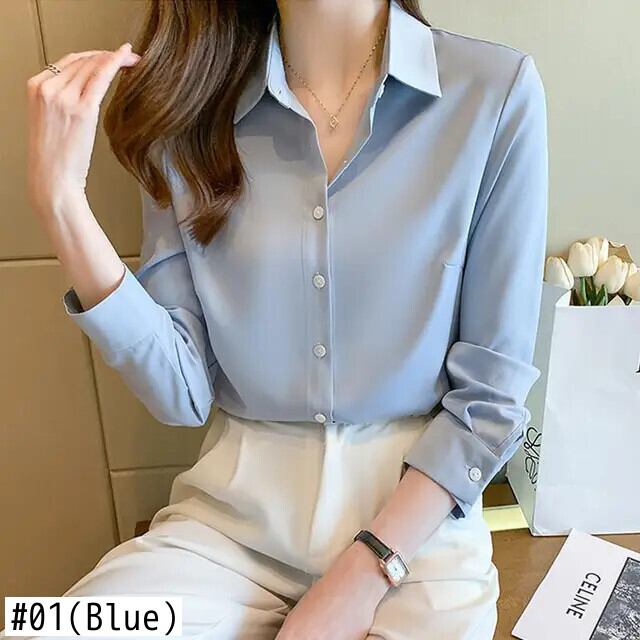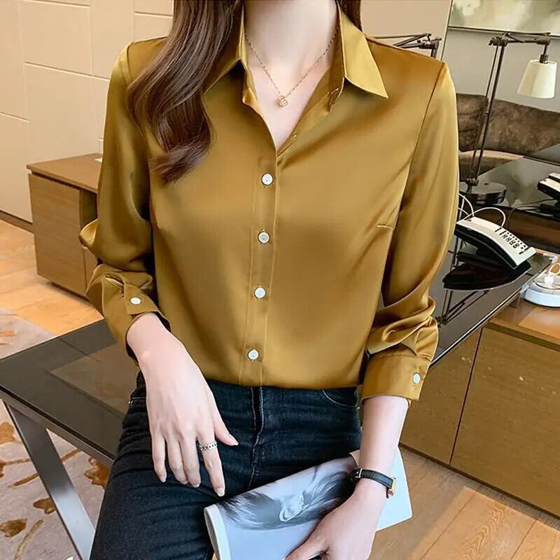 送料無料 ソリッドカラーのラペルボタンオールマッチサテンシャツ女性 2022 秋トップス長袖オフィスレディブラウス ロング オータム 秋物 会社 学校 通勤や通学にも AE1288776699203001319