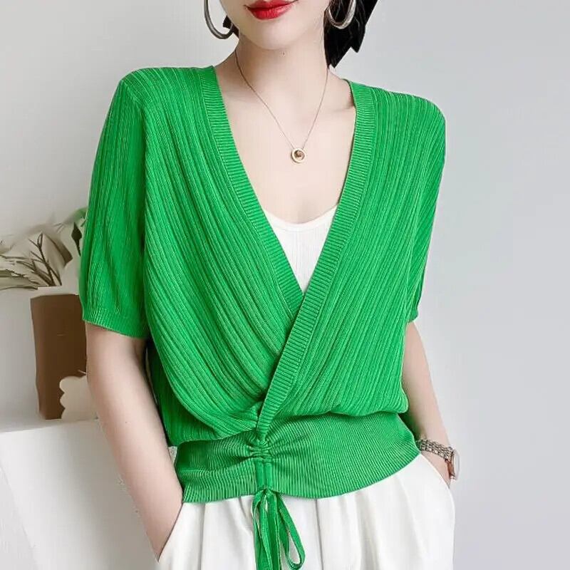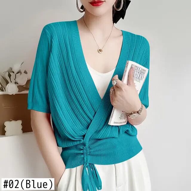 送料無料 V ネックスプライシングシャーリングレースアップリボン非対称ブラウス女性の 2023 夏プルオーバーシャツ サマー 夏物 Vネック AE1288776696203779809