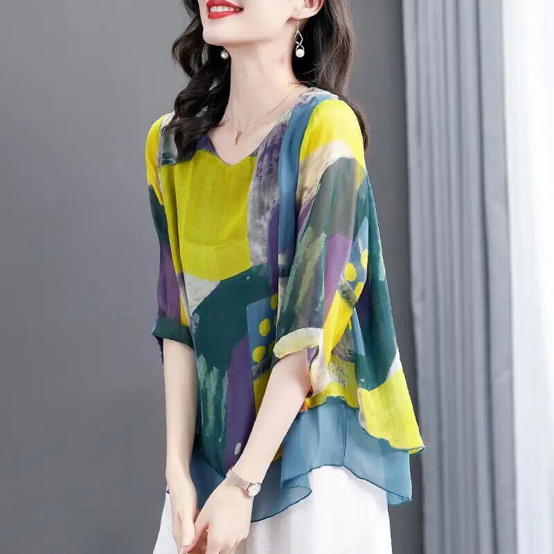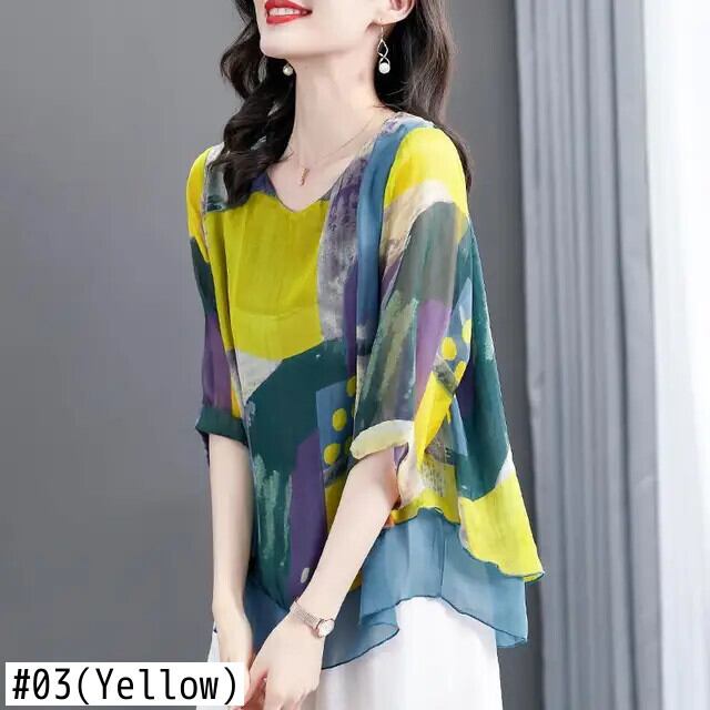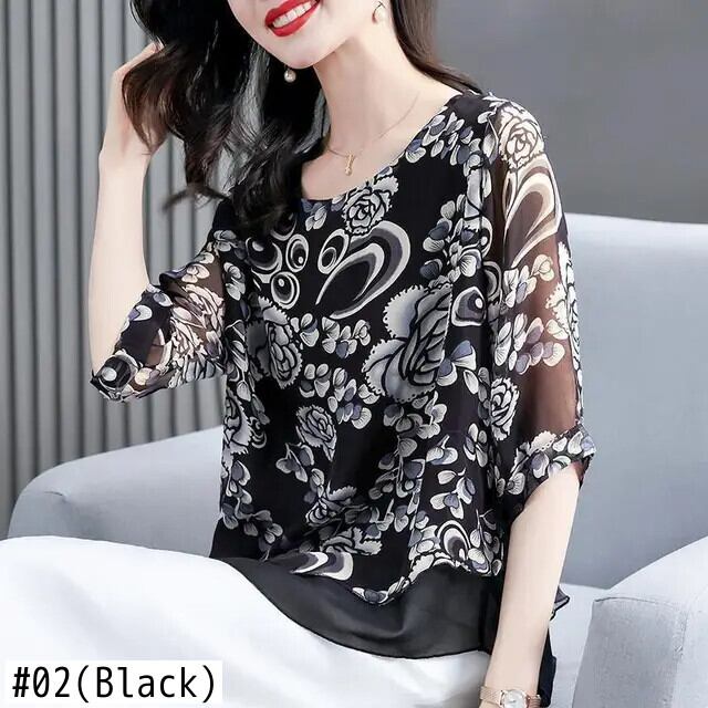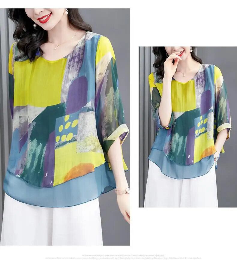 送料無料 ヴィンテージプリントスプライシング 3/4 袖ルーズシフォンブラウス夏 O ネックトップス特大女性通勤シャツ サマー 夏物 Oネック ビンテージ AE1288776680235922699