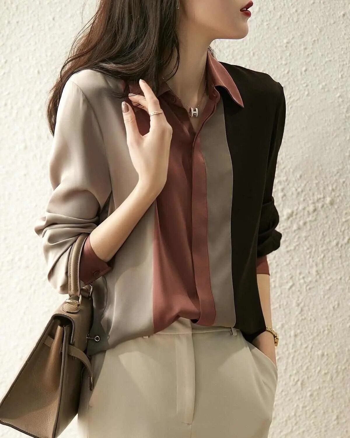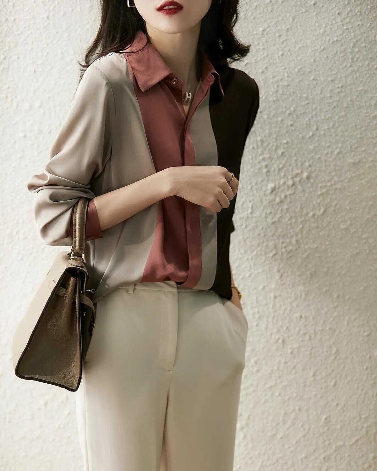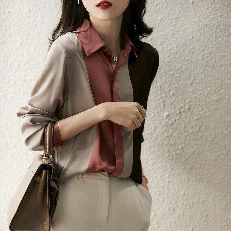送料無料 ラペルスプライスボタン長袖シフォンブラウス春秋ルーズ通勤トップスプラスサイズの女性シャツ ロング 大きめサイズ スプリング 春物 オータム 秋物 AE1288776665762249659