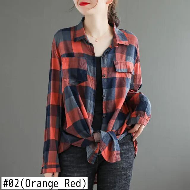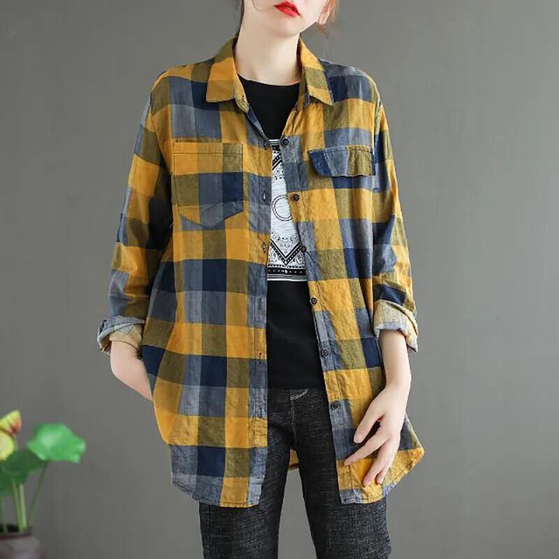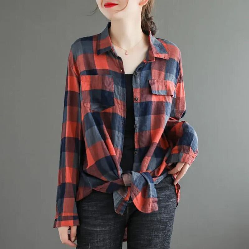 送料無料 プリントスプライスポケット非対称チェック柄シャツ女性の 2023 秋冬トップスブラウス オータム 秋物 ウィンター 冬物 AE1288776644233005631