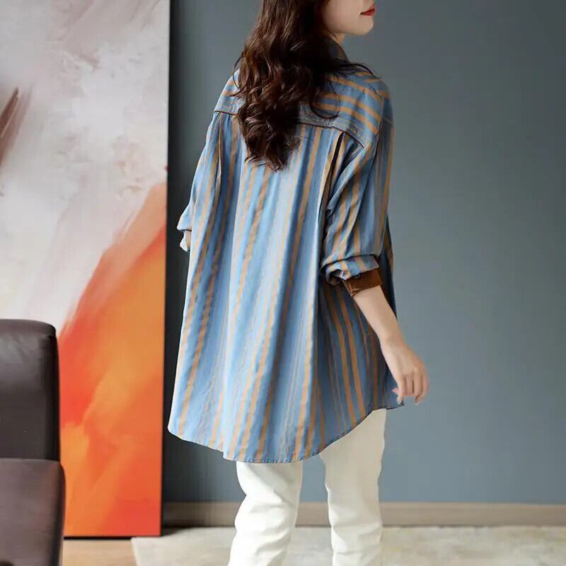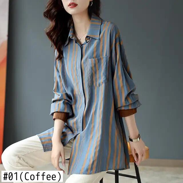 送料無料 ラペルボタンスプライスポケットオールマッチストライプシャツ女性 2023 春特大トップスブラウス スプリング 春物 AE1288776627853988240