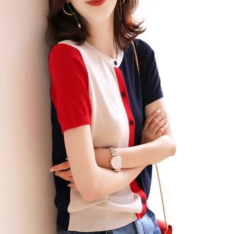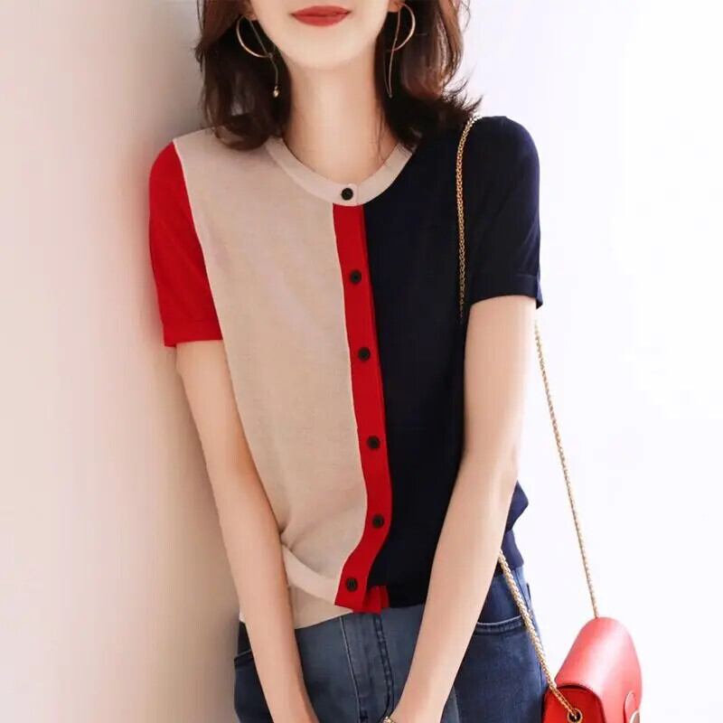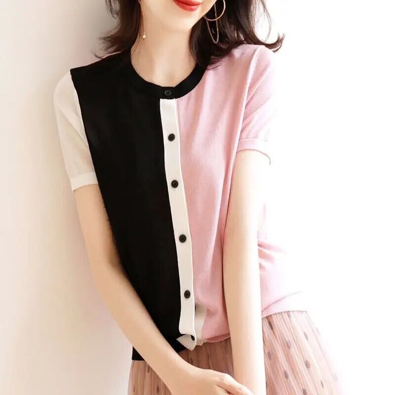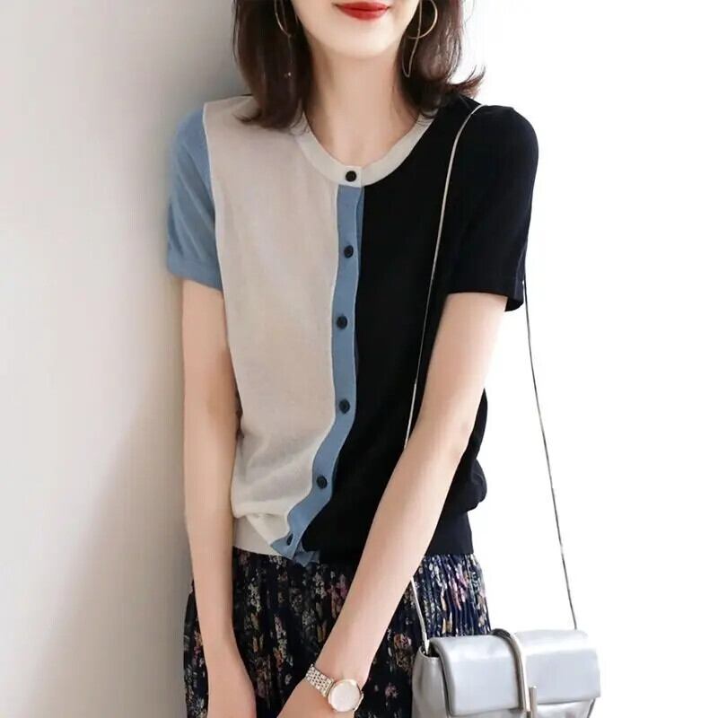 送料無料 O ネックニットボタンルーズ非対称シャツ女性の 2023 夏トップス半袖通勤ブラウス ショート ハーフスリーブ サマー 夏物 Oネック AE1288776628559701412