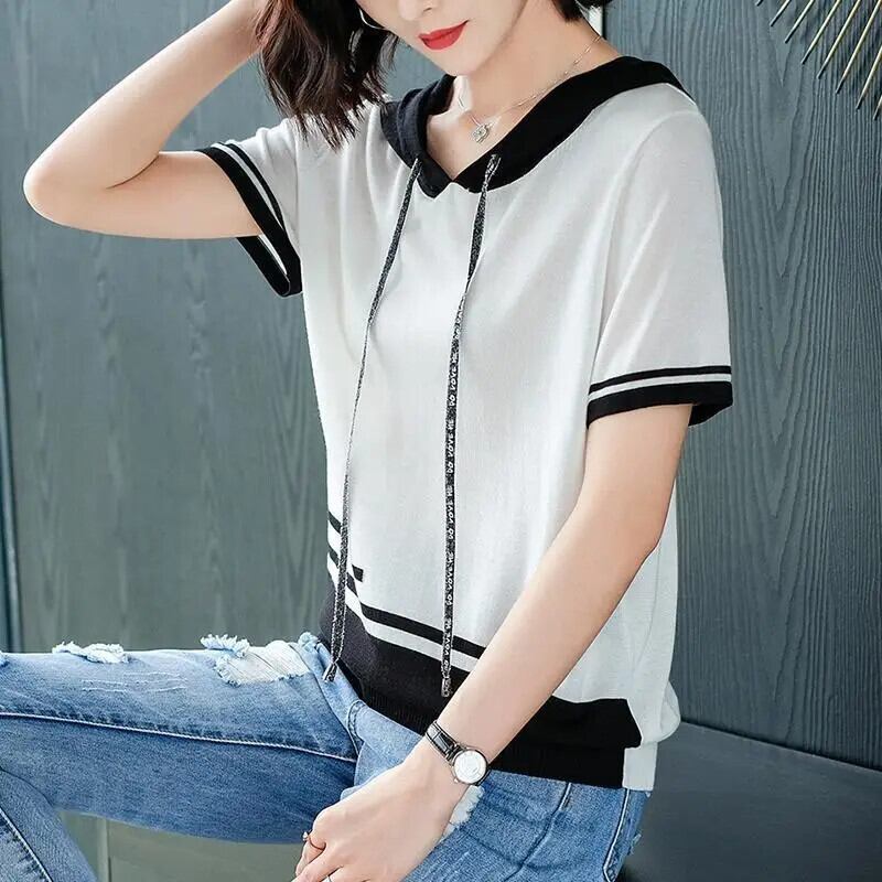 送料無料 プリントスプライスレースアップストライプフード付きブラウス女性の2023夏特大プルオーバーシャツ サマー 夏物 AE1288776651588038913
