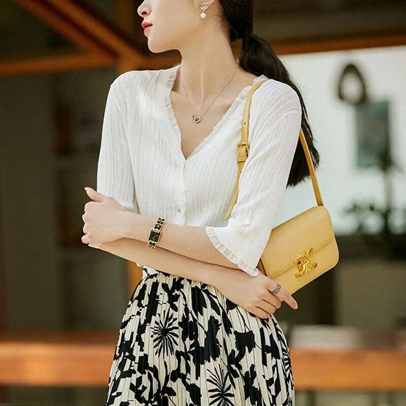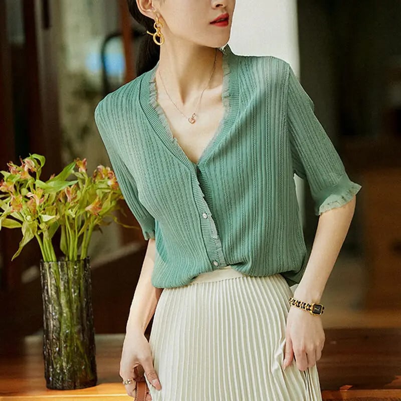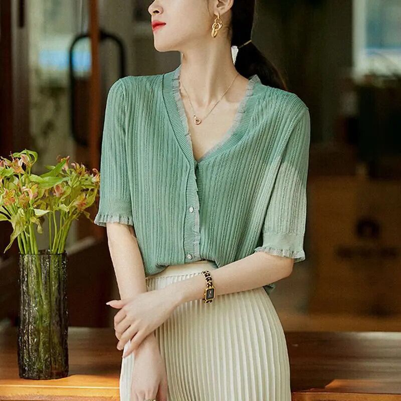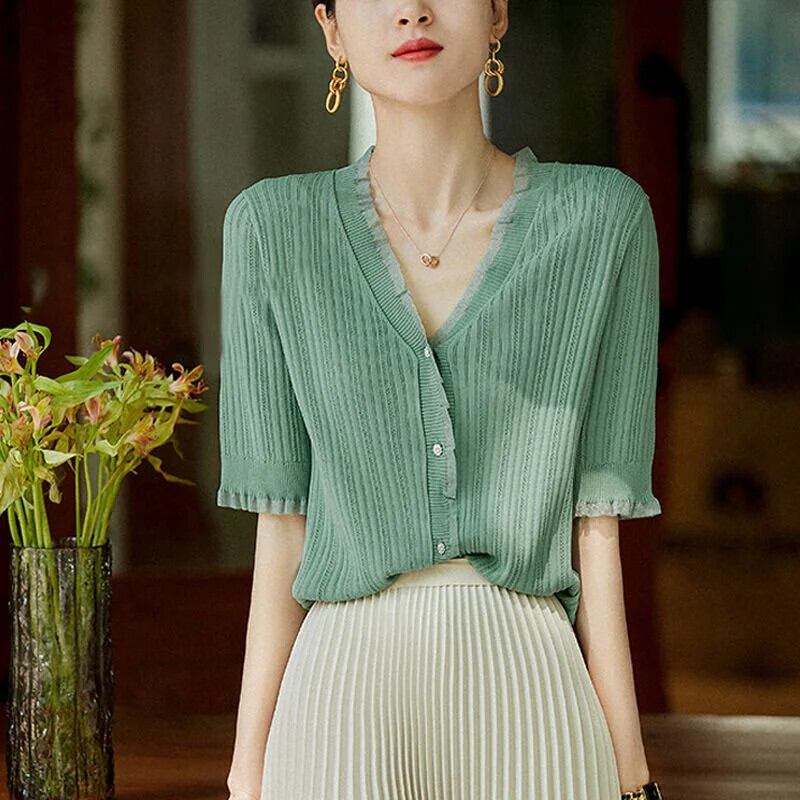 送料無料 V ネックボタンニットスプライシングガーゼフリルシャツレディース 2023 春トップスオールマッチ通勤ブラウス ラッフル スプリング 春物 Vネック AE1288776623858282089