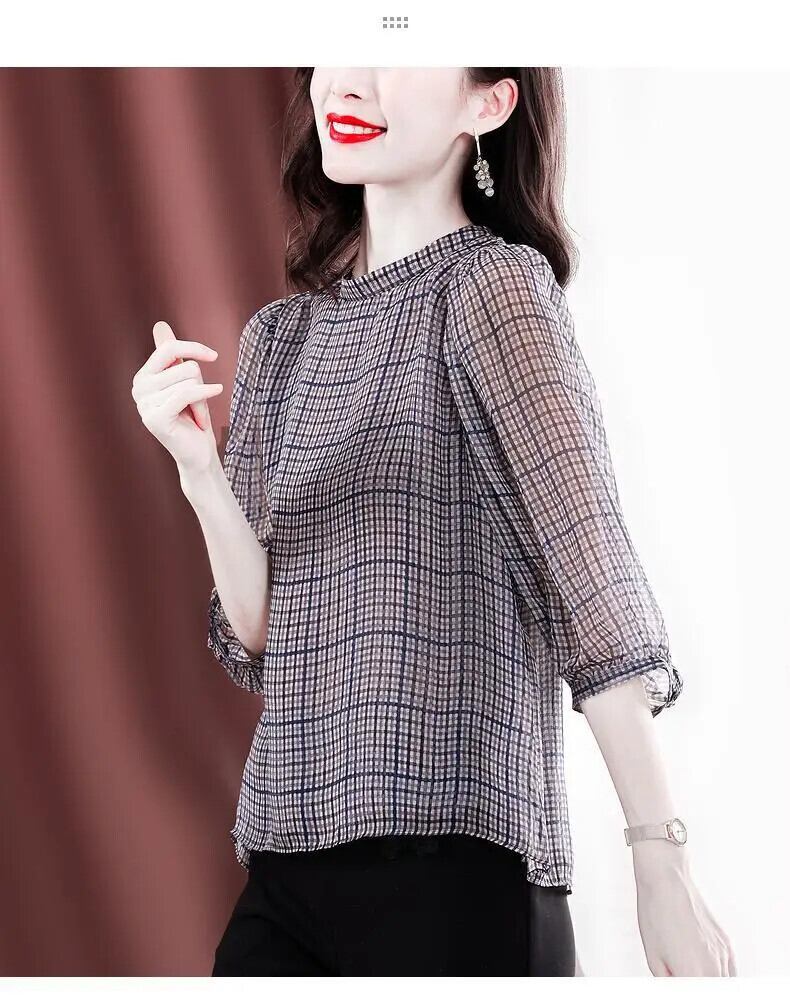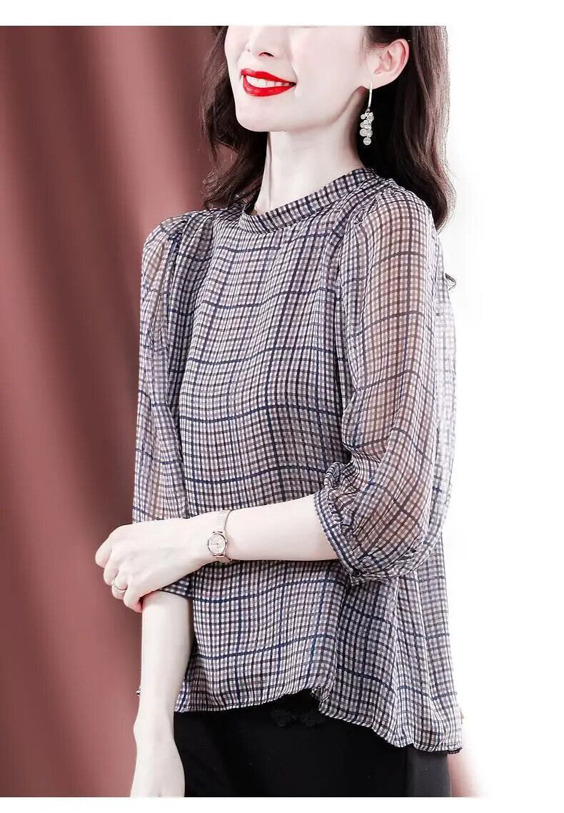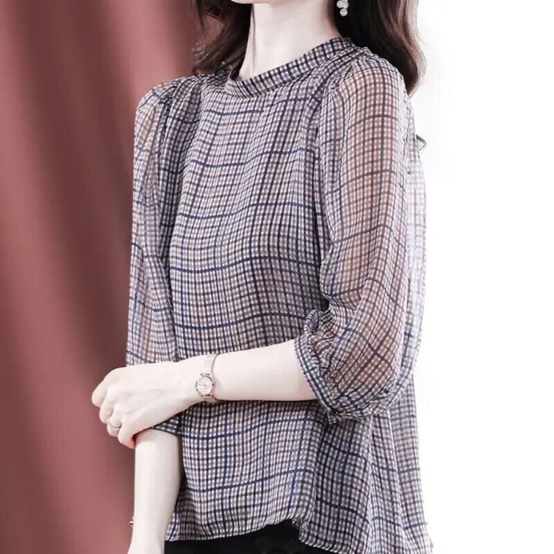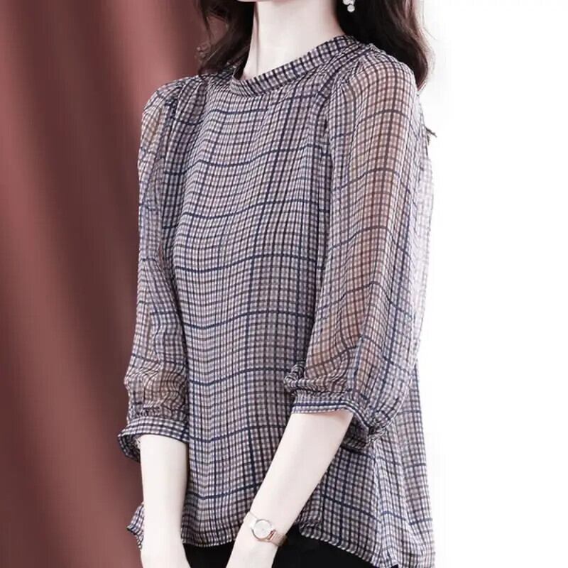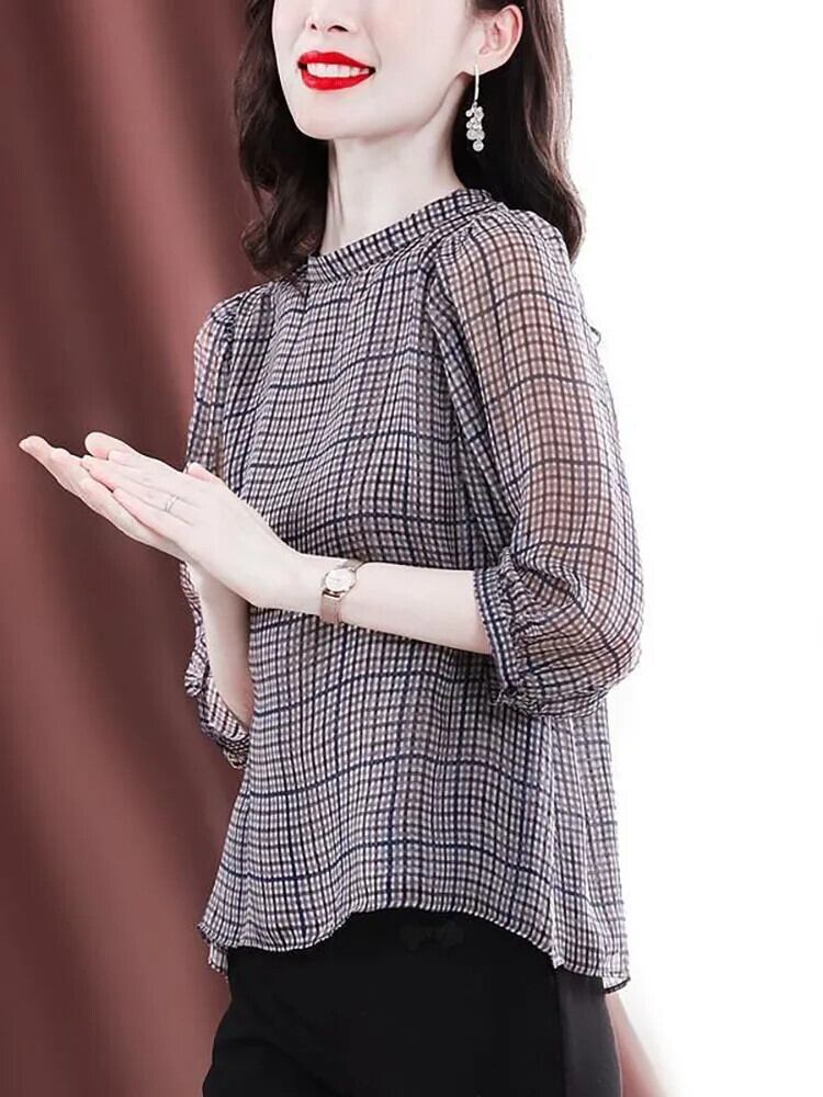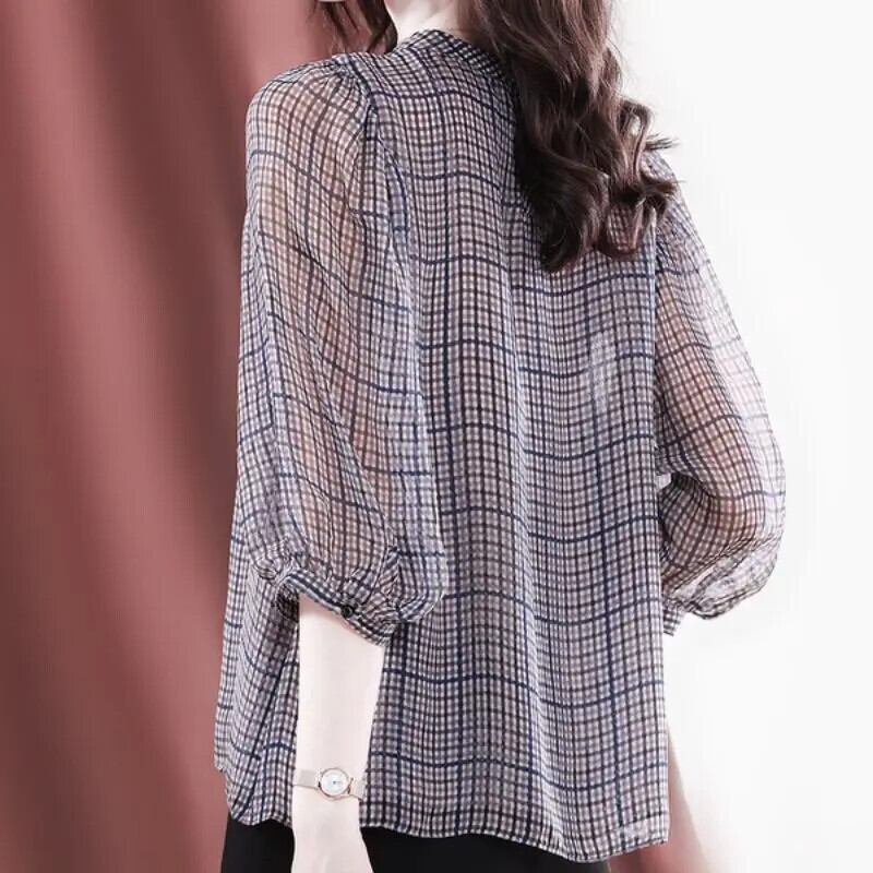 送料無料 プリントオールマッチ格子シフォンブラウスレディース 2024 春特大プルオーバーオフィスレディシャツ スプリング 春物 会社 学校 通勤や通学にも AE1288776637719138572