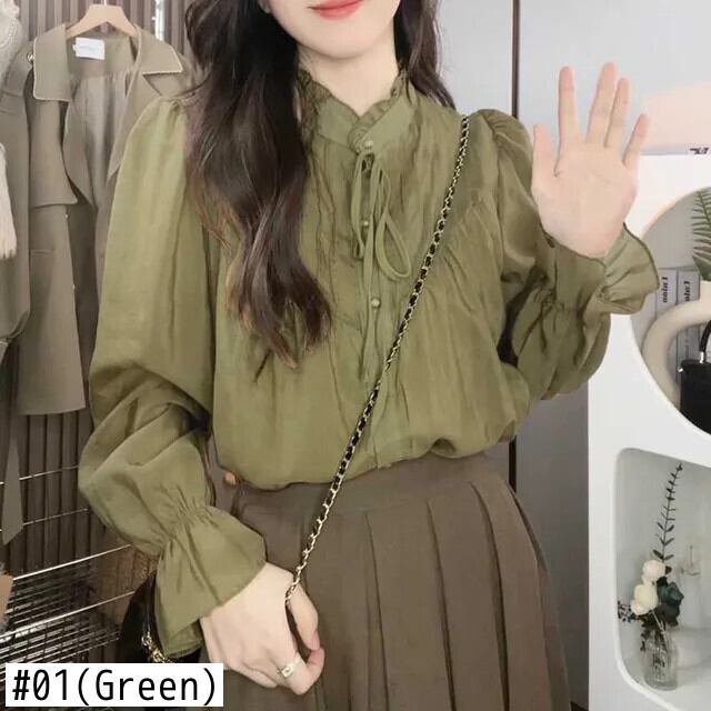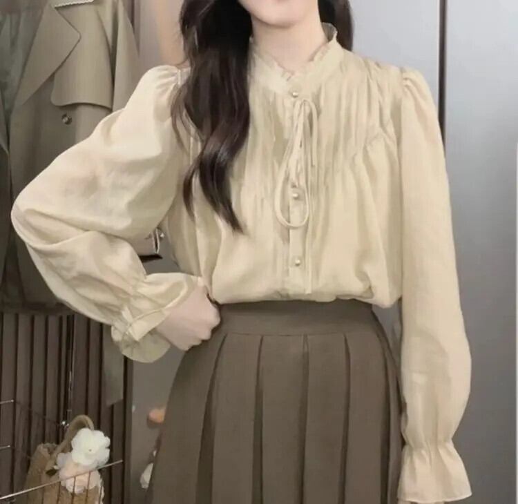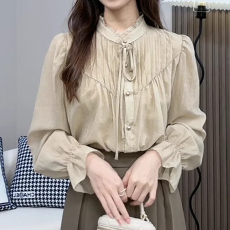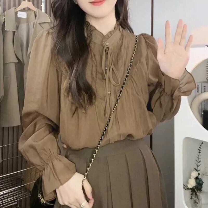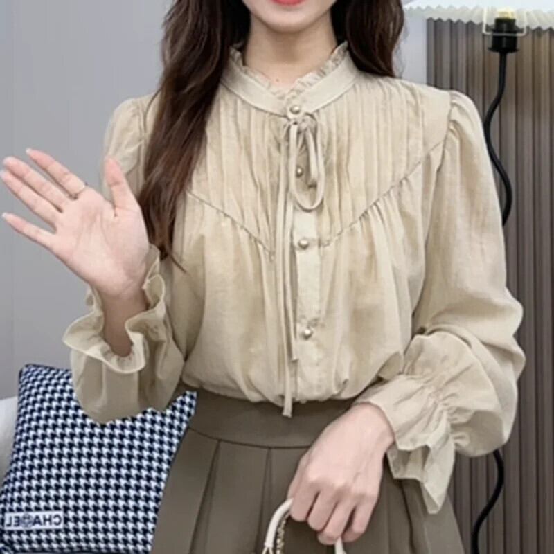 送料無料 フリルネックレースアップフレアスリーブシャツ女性 2023 秋冬ルーズオールマッチトップスオフィスレディブラウス オータム 秋物 ウィンター 冬物 会社 学校 通勤や通学にも AE1288776661073587056