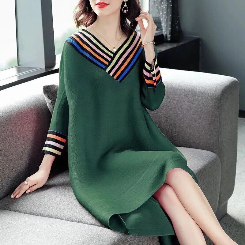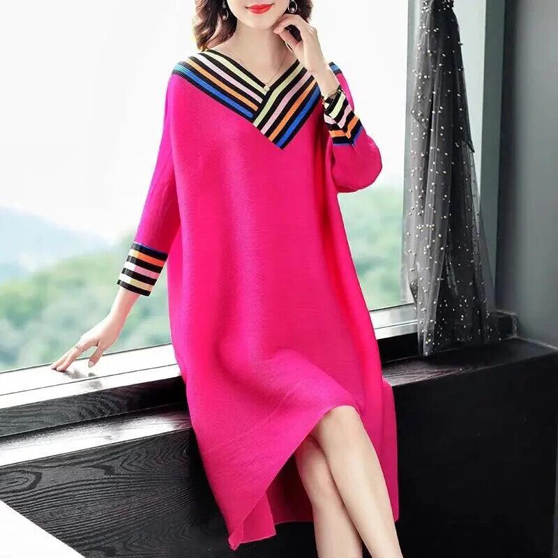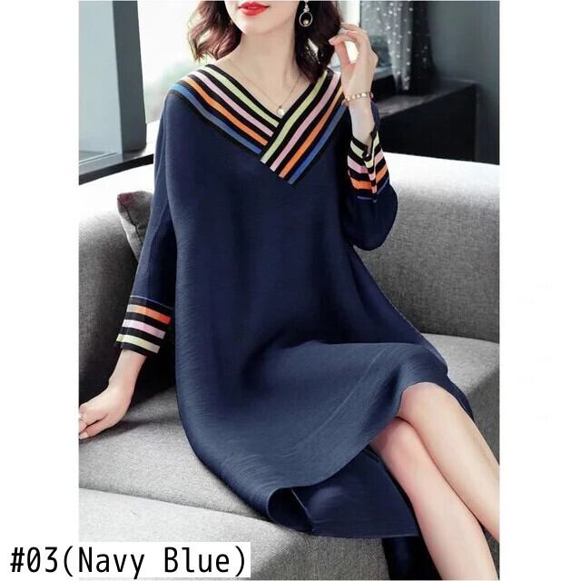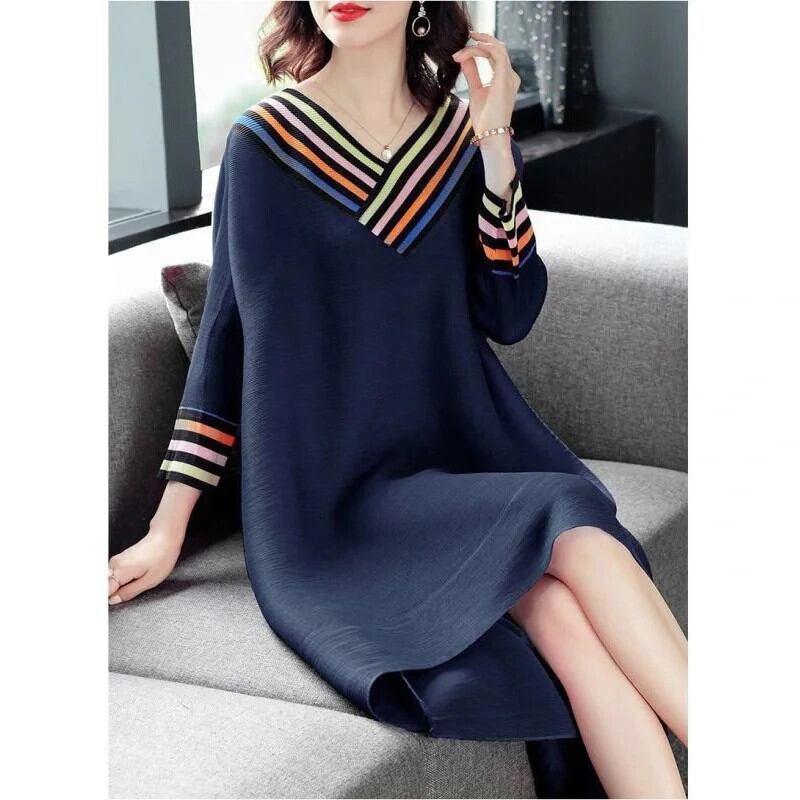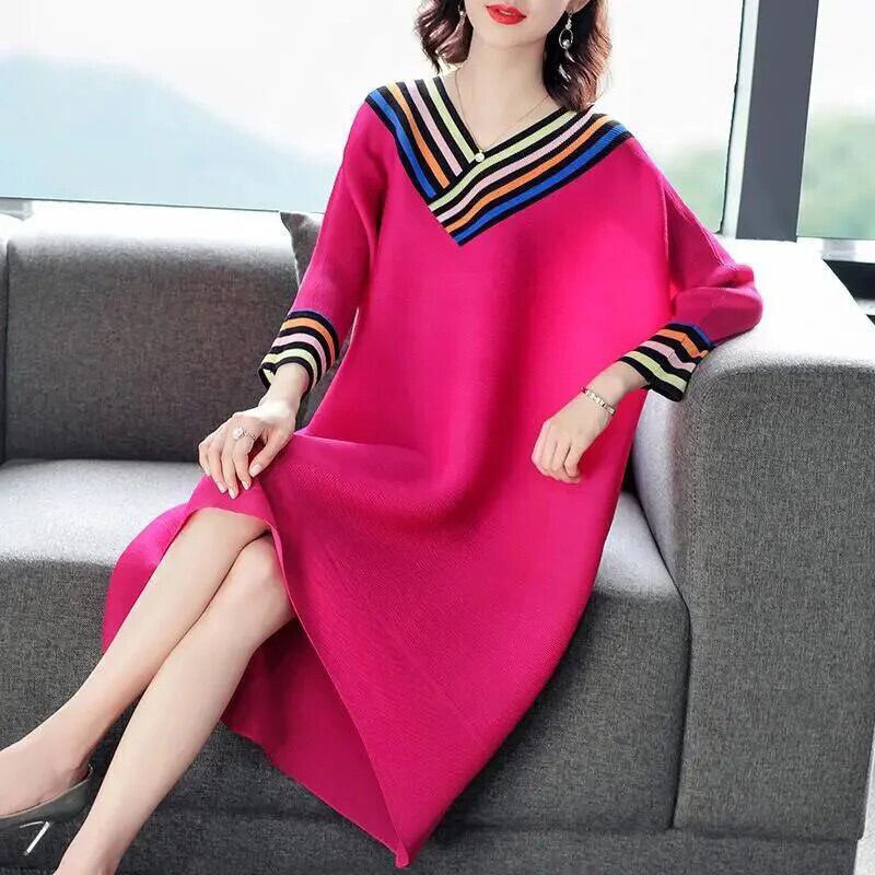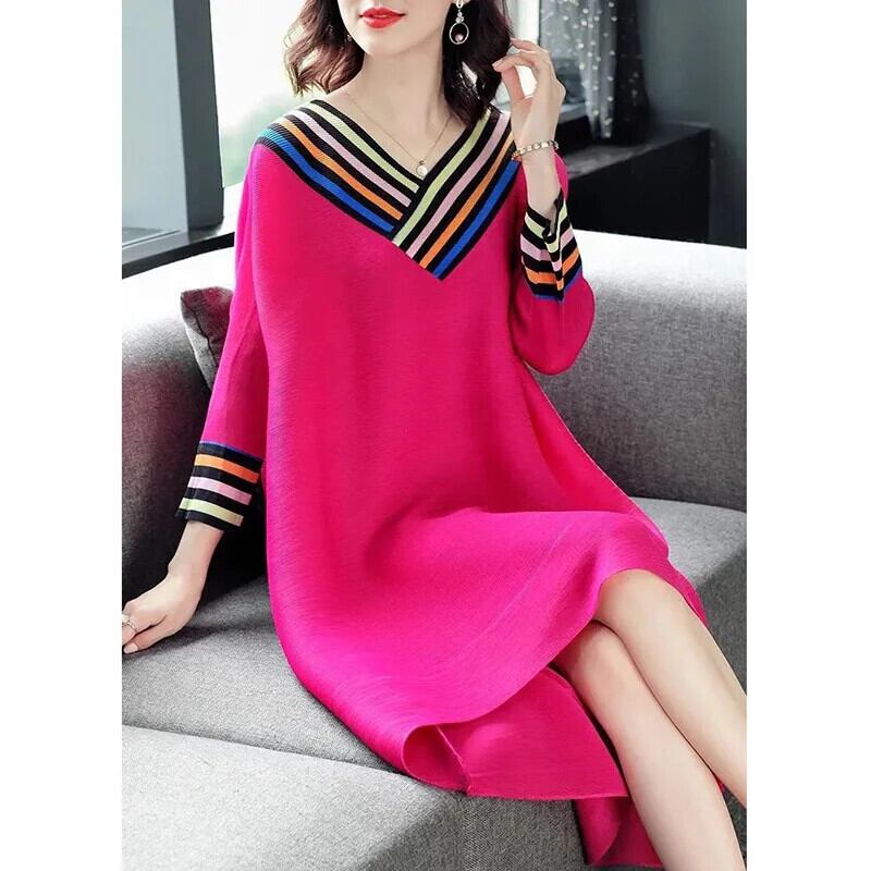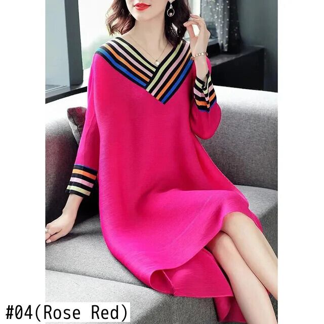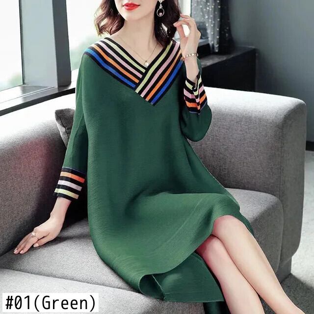 送料無料 Vネックスプライシングルーズプリントストライプミディドレスレディース2023秋オーバーサイズドレス オータム 秋物 AE1288776638630761276