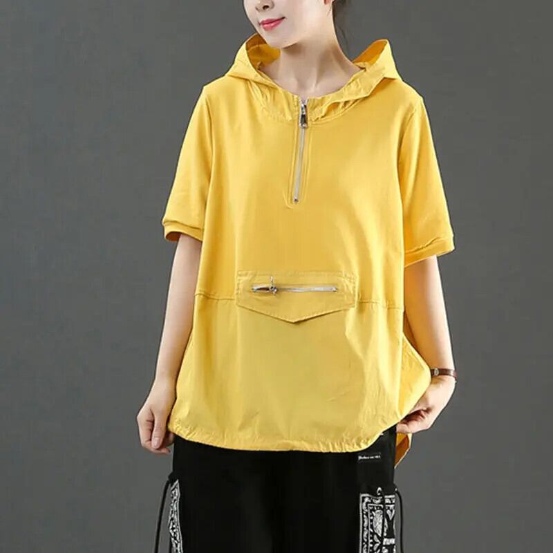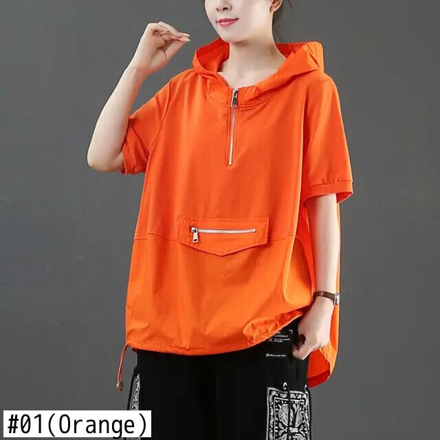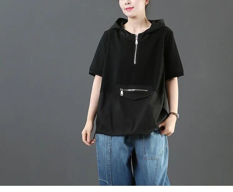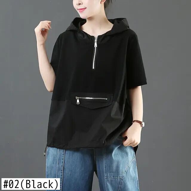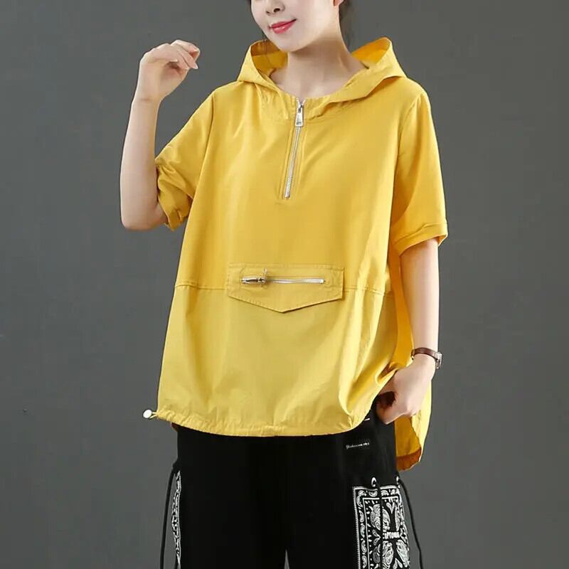 送料無料 フード付きスプライスジッパーシャーリングポケットブラウス女性 2023 夏特大通勤トップスシャツ サマー 夏物 AE1288776622915551676