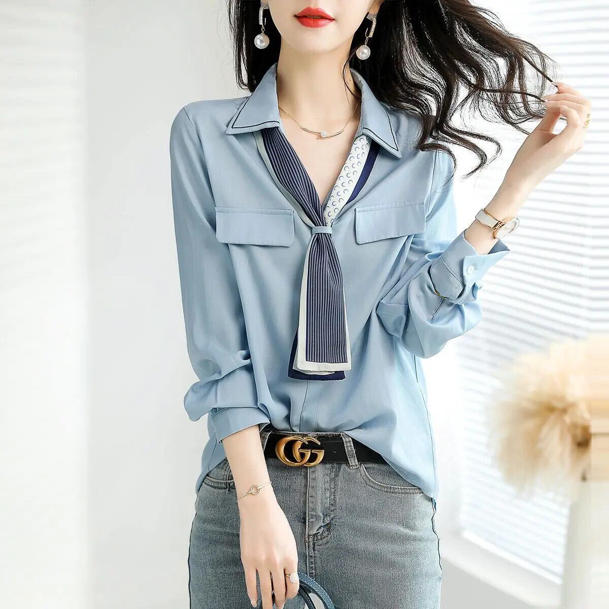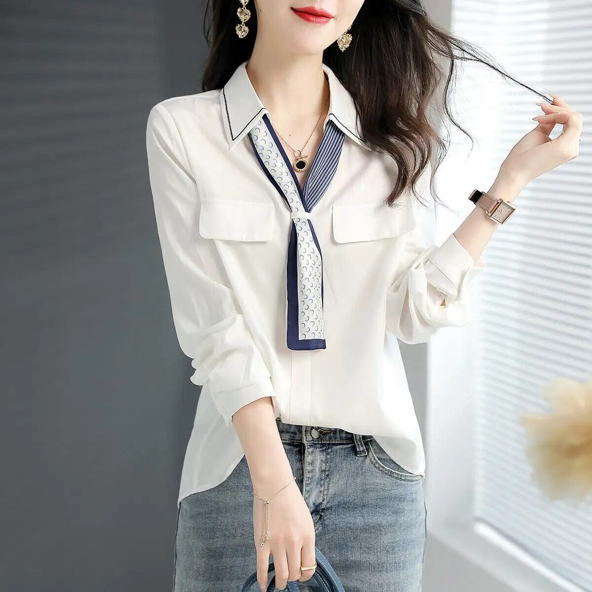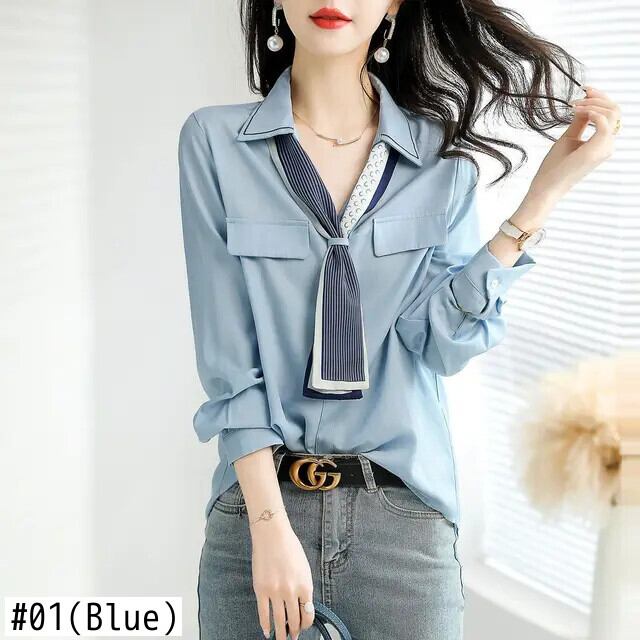 送料無料 V ネックボタンスプライシングオールマッチレースアップブラウス女性の 2023 春プルオーバールーズオフィスレディシャツ スプリング 春物 Vネック 会社 学校 通勤や通学にも AE128877669815202281