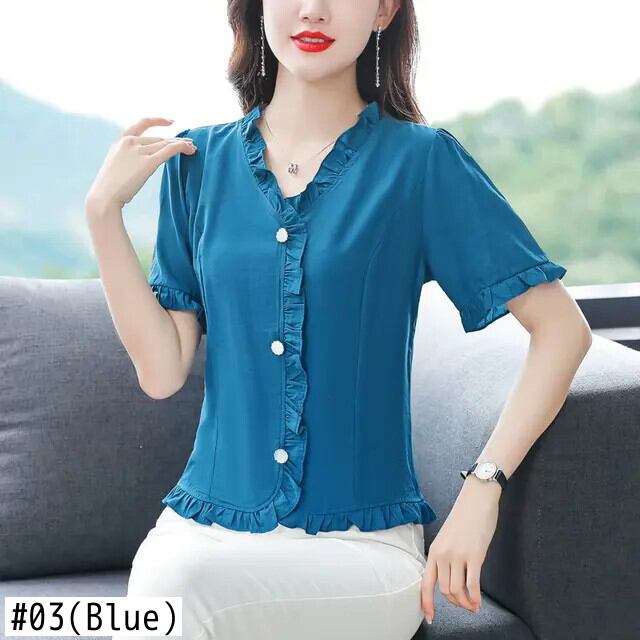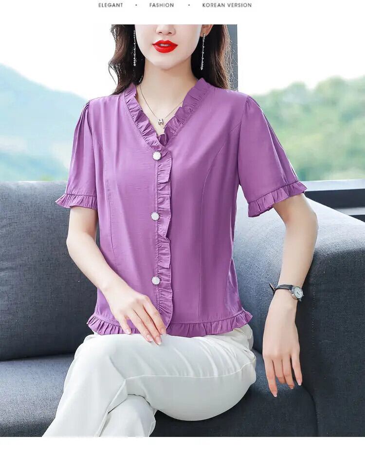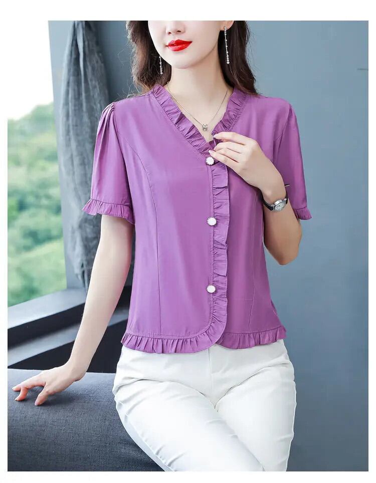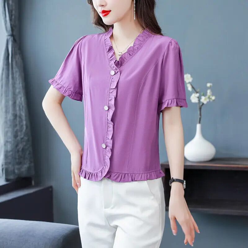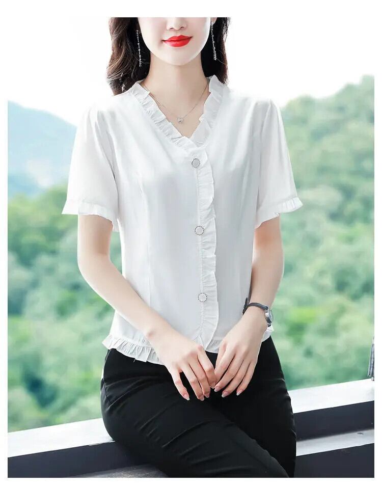 送料無料 V ネック無地シフォンフリルシャツ 2022 夏ボタントップス特大ルーズ女性の通勤シャツ ラッフル サマー 夏物 Vネック ソリッドカラー AE1288776626801287807