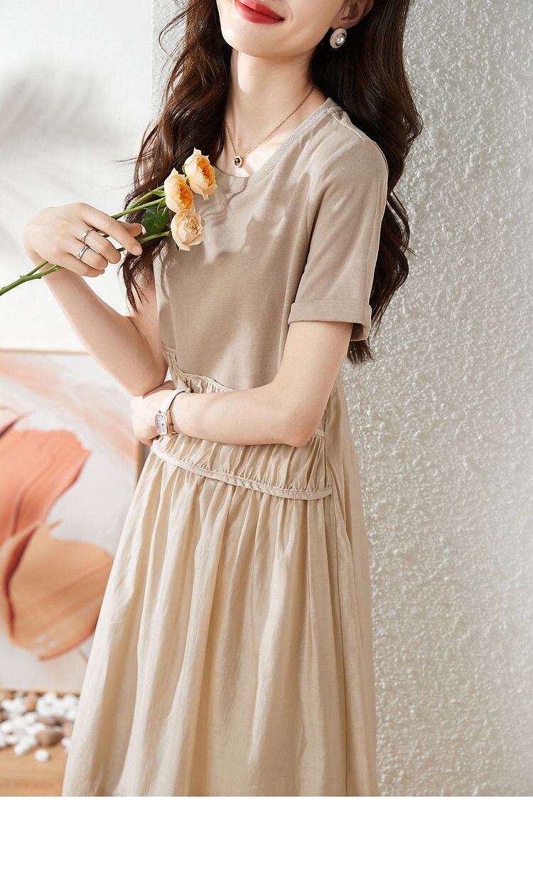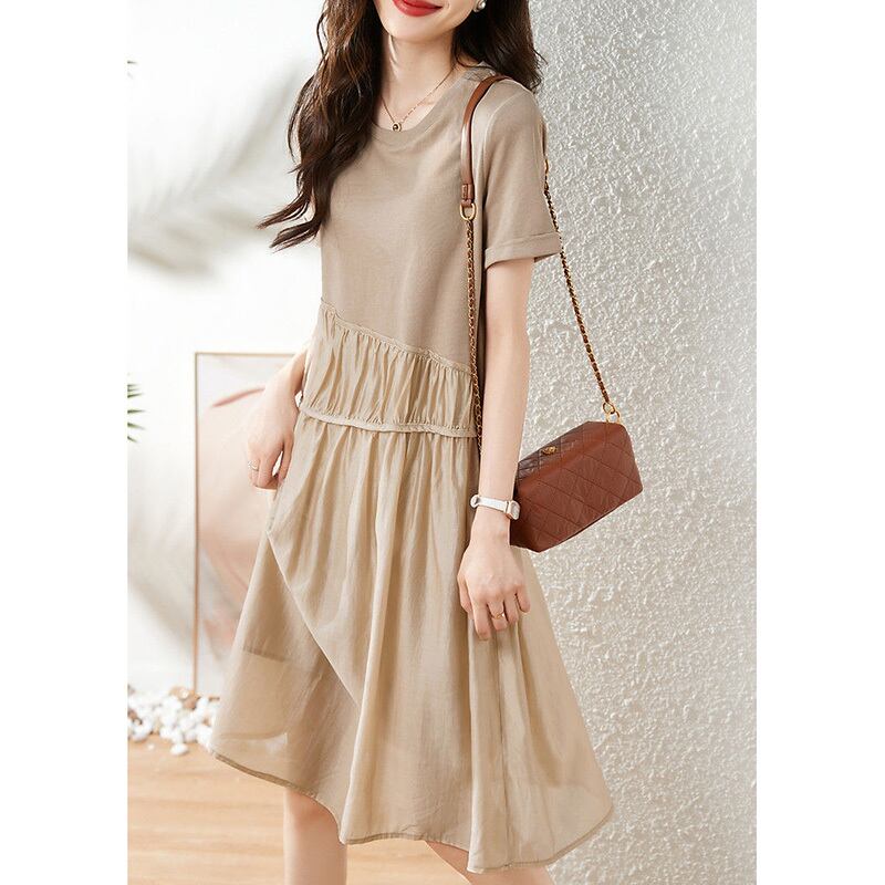 送料無料 O ネックスプライシングひだ半袖ドレス女性の 2024 夏ルーズオールマッチソリッドカラーパーティードレス ショート ハーフスリーブ サマー 夏物 Oネック AE1288776695263838784