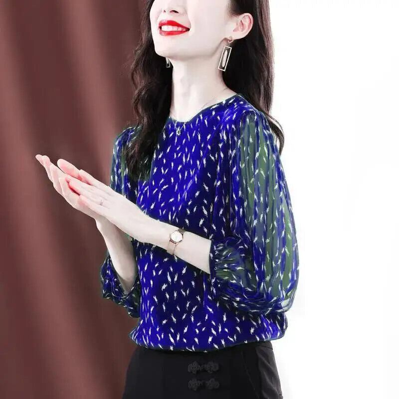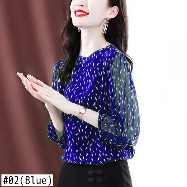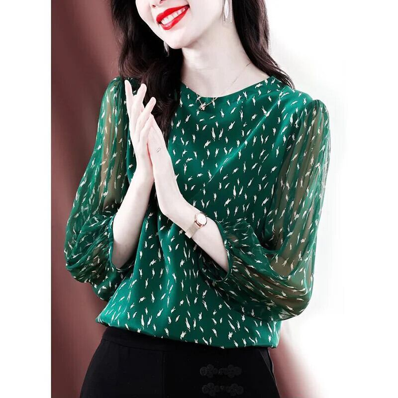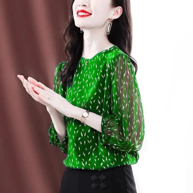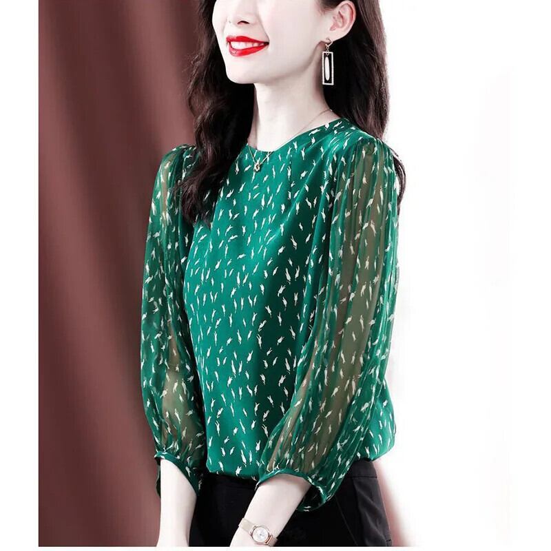 送料無料 O ネックプリントオールマッチ折り目シフォンブラウス女性の 2023 夏プルオーバールーズオフィスレディシャツ サマー 夏物 Oネック 会社 学校 通勤や通学にも AE1288776648410164874