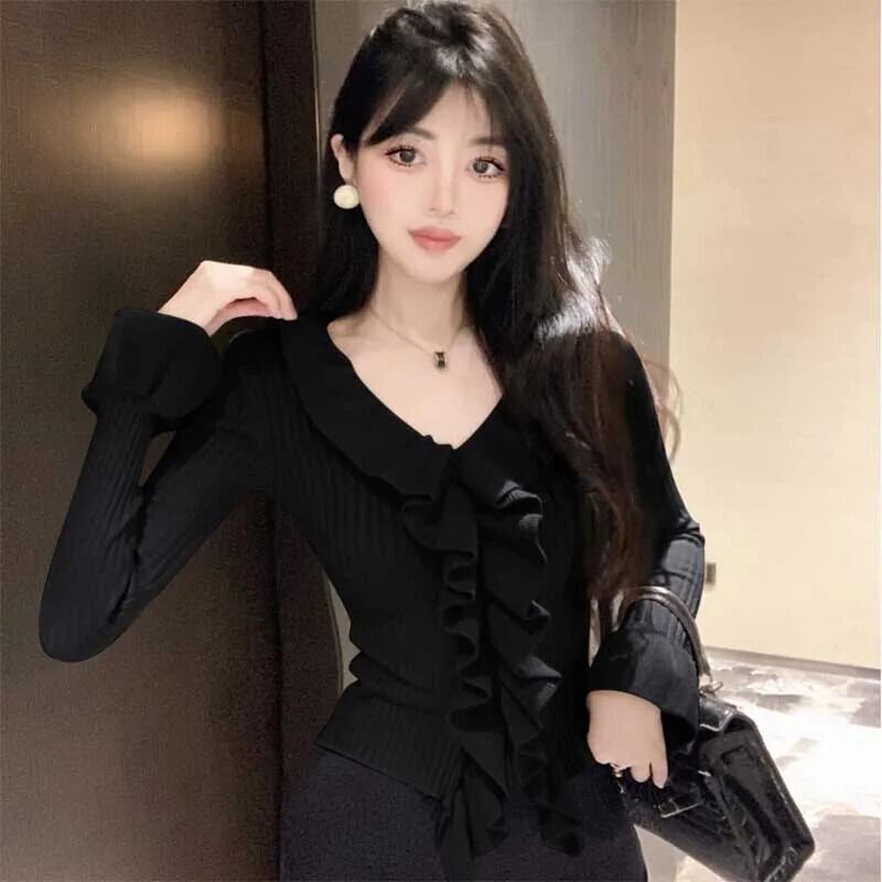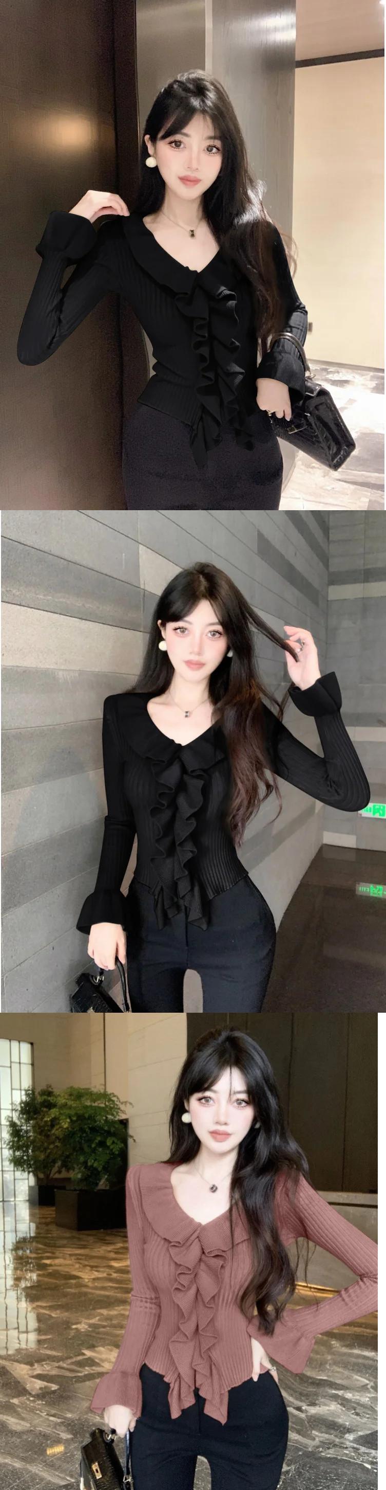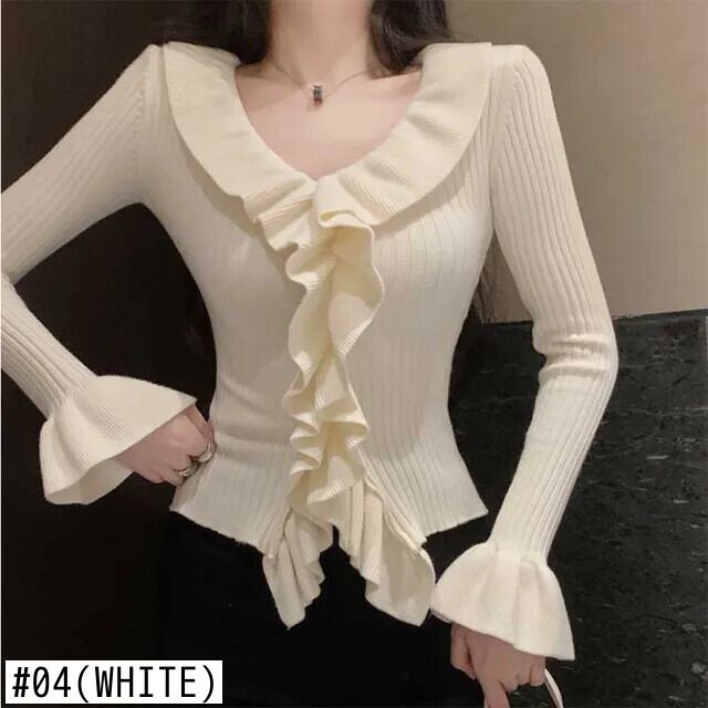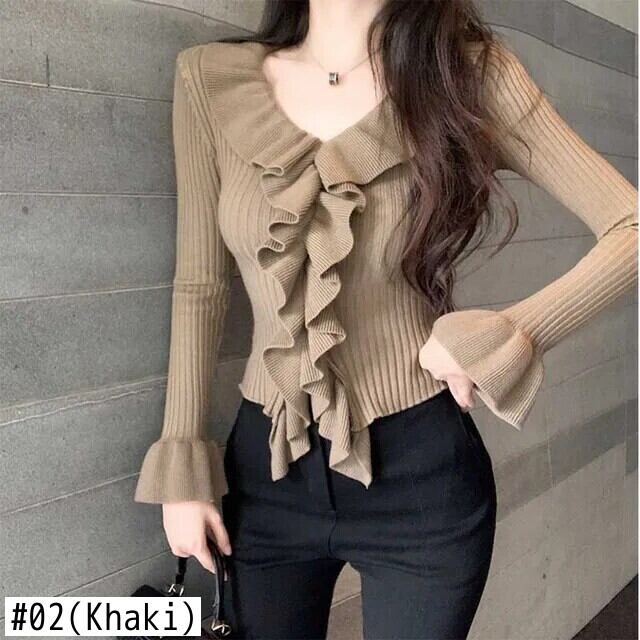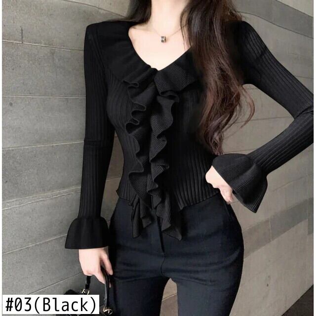 送料無料 V ネック スプライス フリル フレア スリーブ ブラウス レディース 2024 春 スリム ニット トップス シャツ フレアスリーブ ラッフル スプリング 春物 Vネック AE1288776666040906341