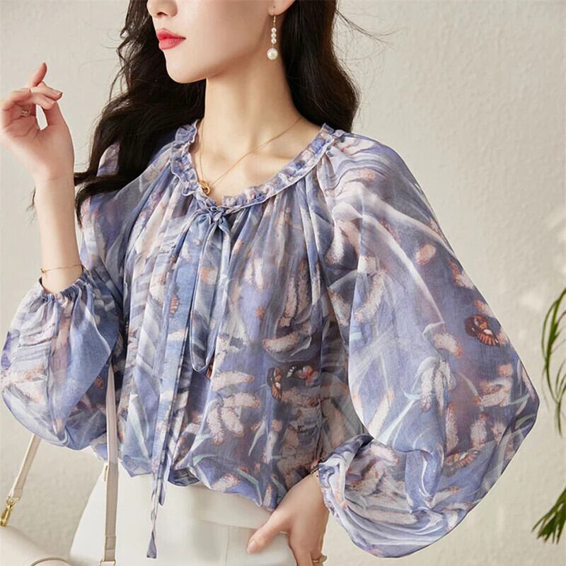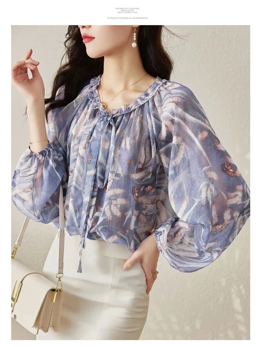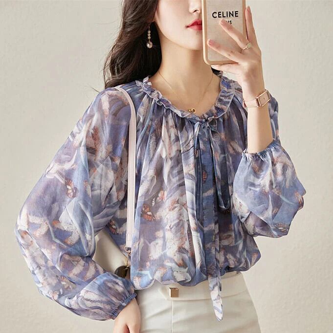 送料無料 プリントフリルレースアップ弓花ブラウス女性 2024 春夏ルーズオールマッチトップスオフィスレディシャツ リボン スプリング 春物 サマー 夏物 花柄 会社 学校 通勤や通学にも AE1288776648680698963