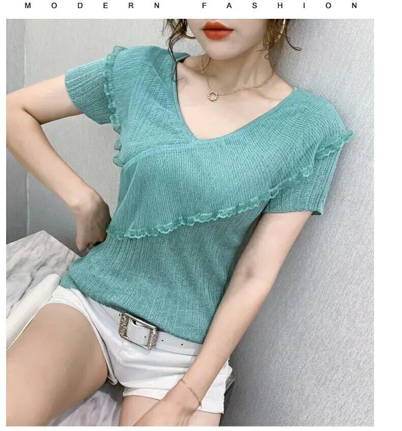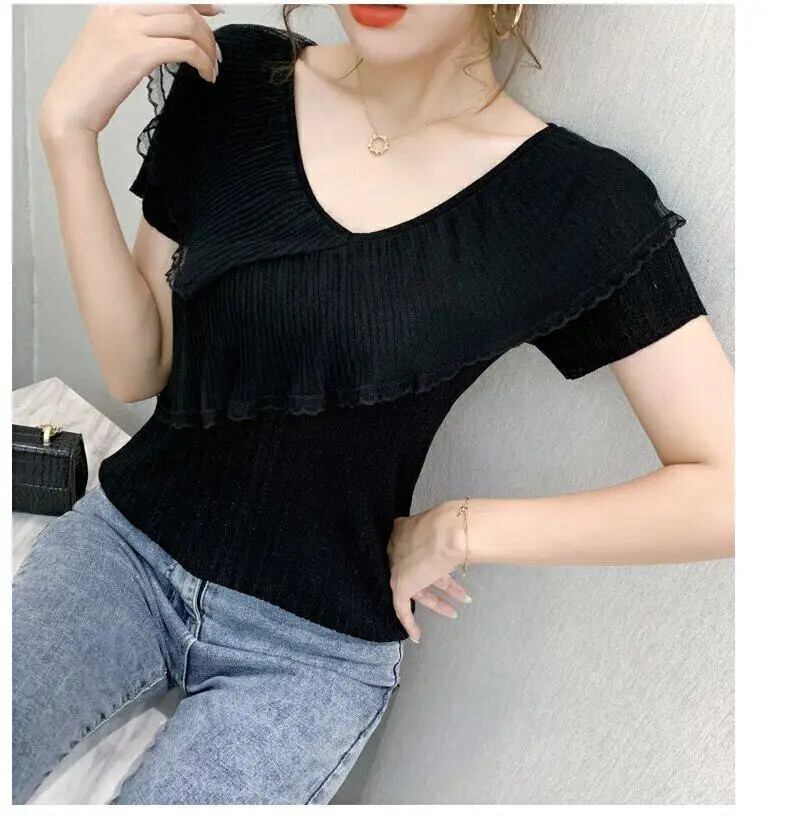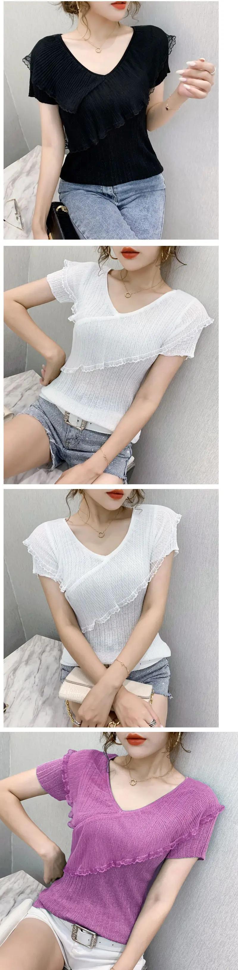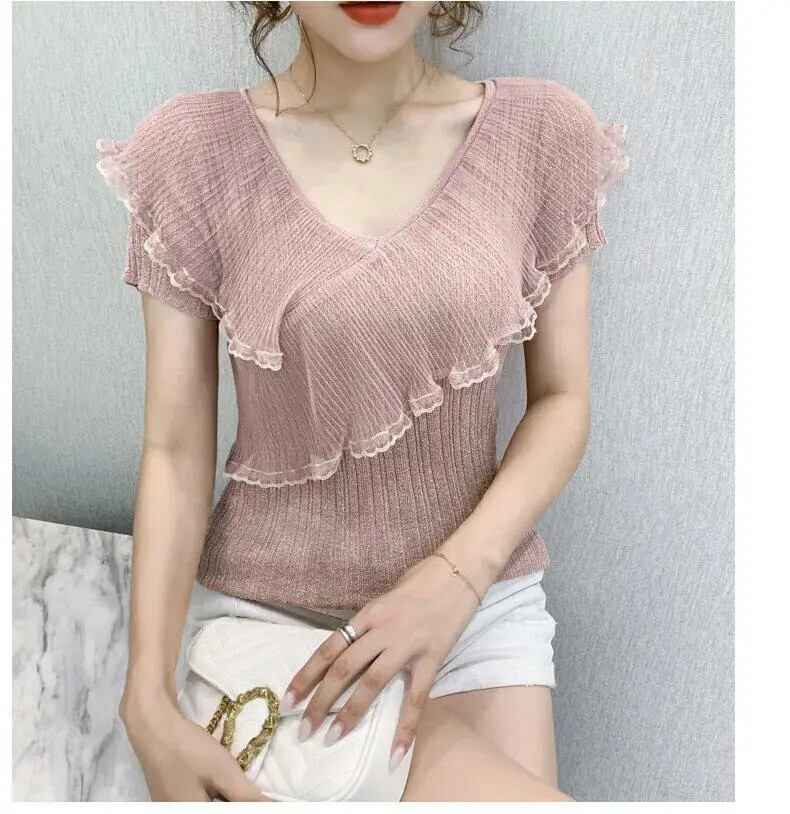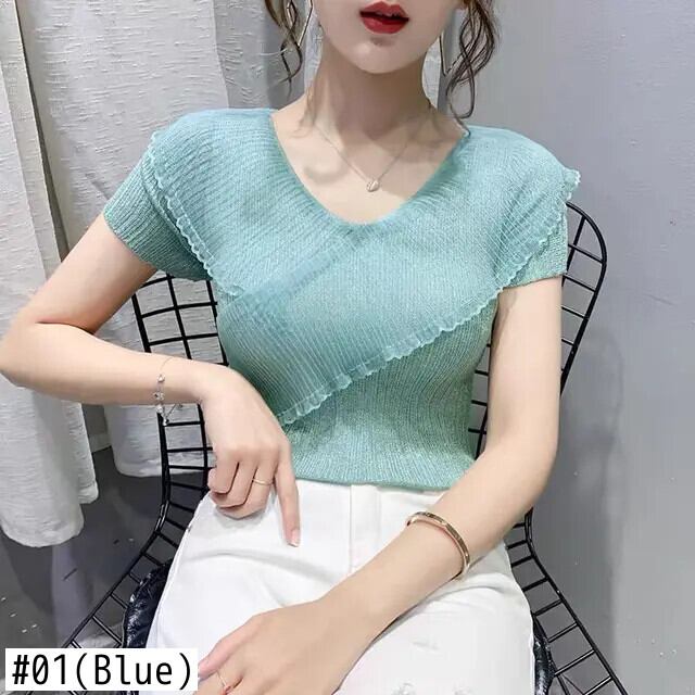 送料無料 V ネックスプライシングガーゼフリルブラウス女性の 2023 夏プルオーバーオールマッチオフィスレディシャツ ラッフル サマー 夏物 Vネック 会社 学校 通勤や通学にも AE1288776610786700083