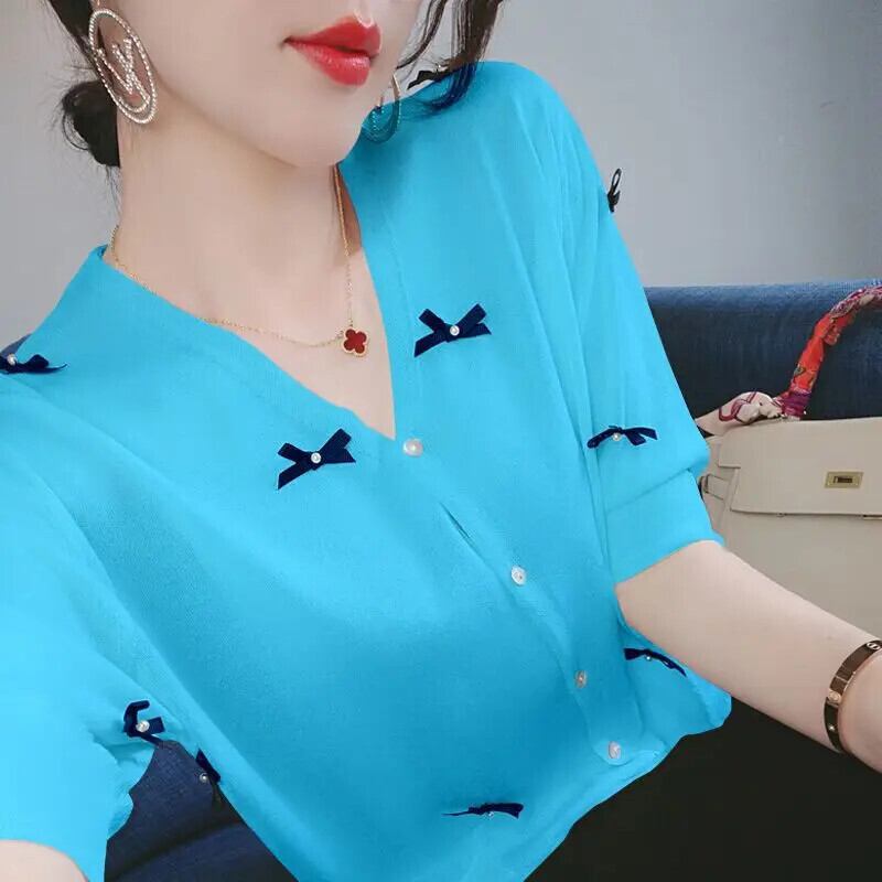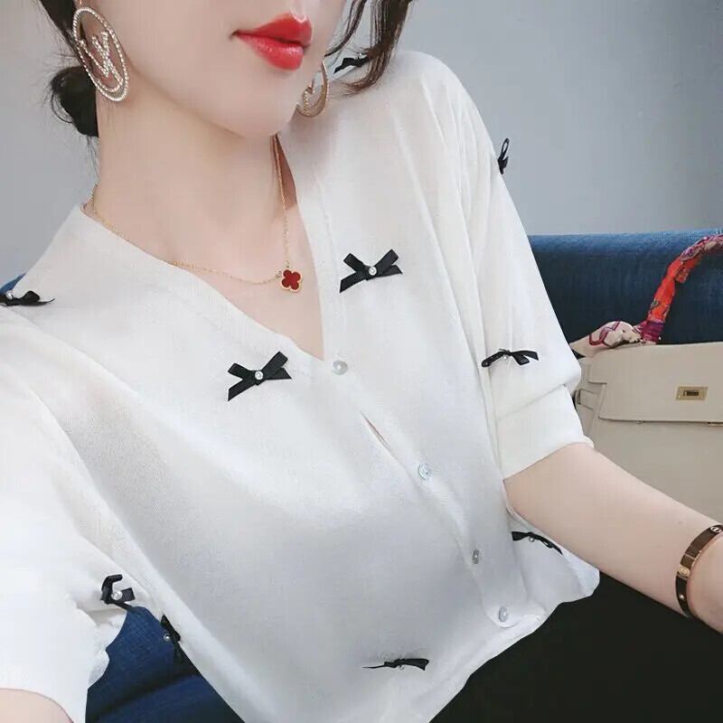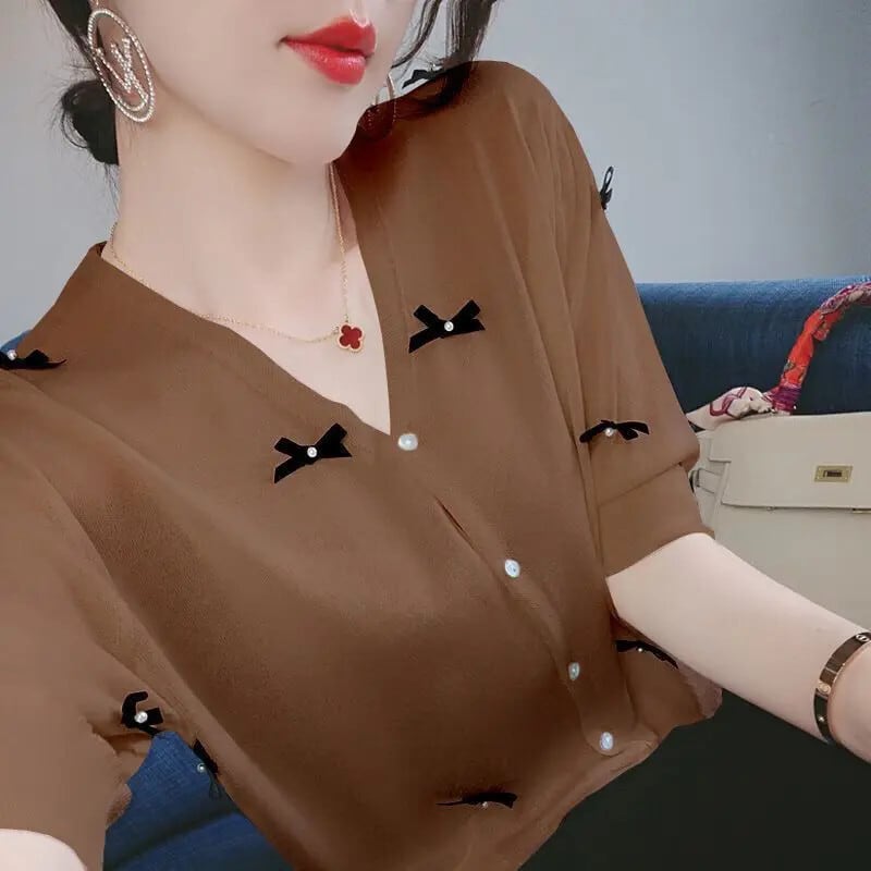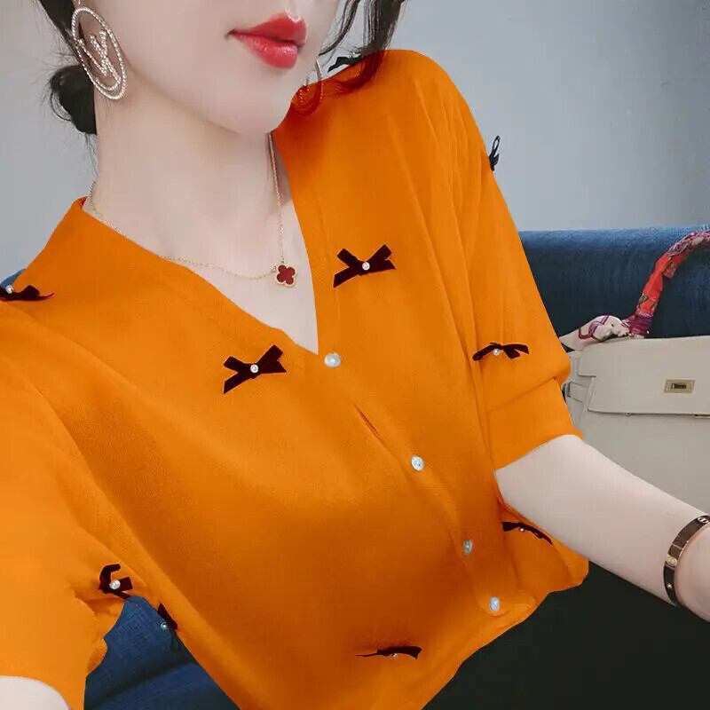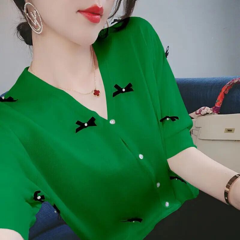 送料無料 V ネックボタンルーズリボンビーズシャツ女性の 2023 夏特大トップスオールマッチ通勤ブラウス サマー 夏物 Vネック AE1288776693428580511