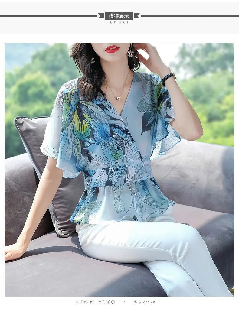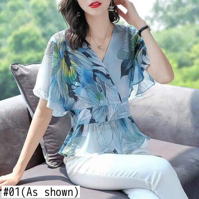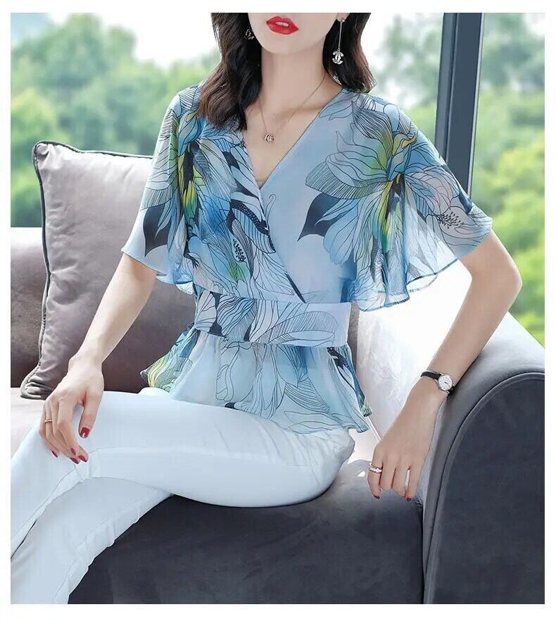 送料無料 ヴィンテージプリント V ネックバタフライスリーブシフォンシャツ通勤プルオーバー 2022 夏の女性のブラウス サマー 夏物 Vネック ビンテージ AE1288776641864905305