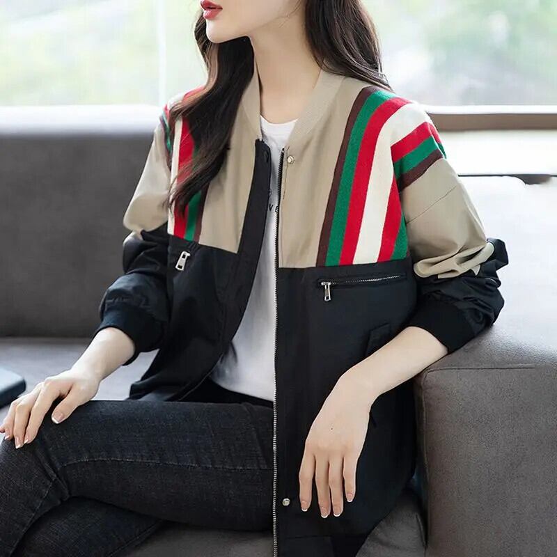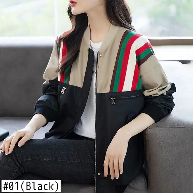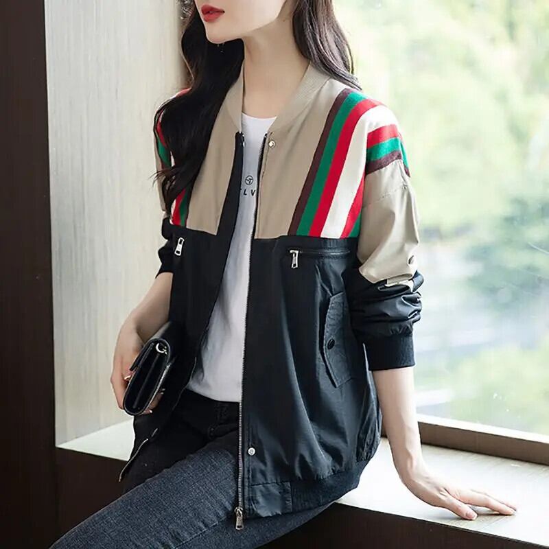 送料無料 ジッパーポケットスプライシングストライプコート女性の 2023 秋冬ルーズオールマッチトップス通勤ジャケット オータム 秋物 ウィンター 冬物 AE128877667674087650