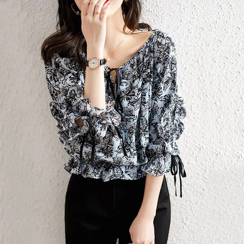 送料無料 ヴィンテージプリントスプライシングレースアップ弓中空アウト花柄ブラウス女性の 2023 夏プルオーバー甘いシャツ リボン 大人ガーリー スウィート キュート カジュアル サマー 夏物 ビンテージ AE1288776644790661276