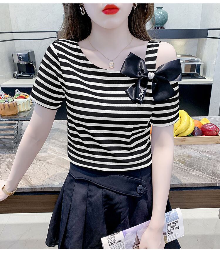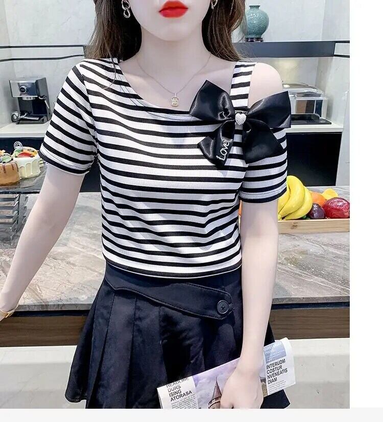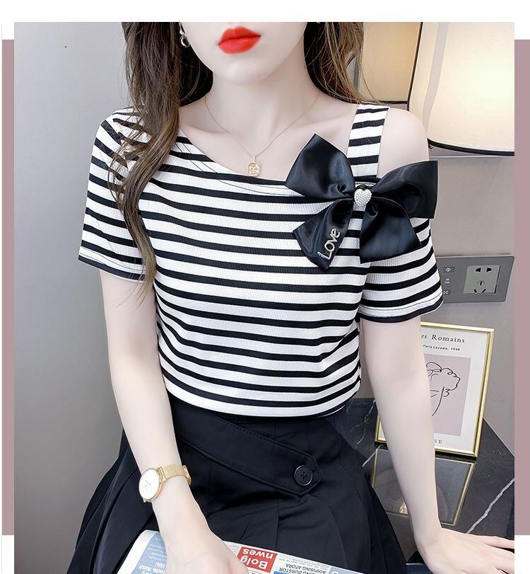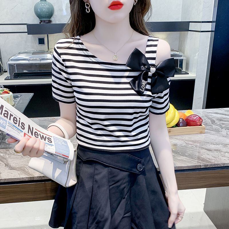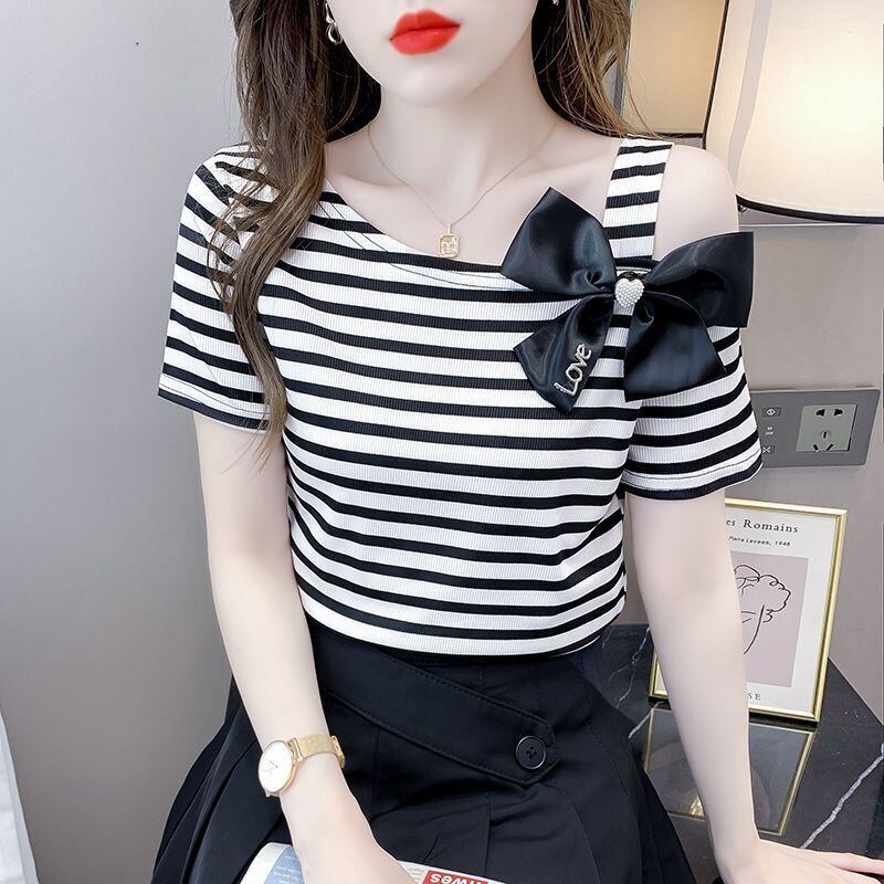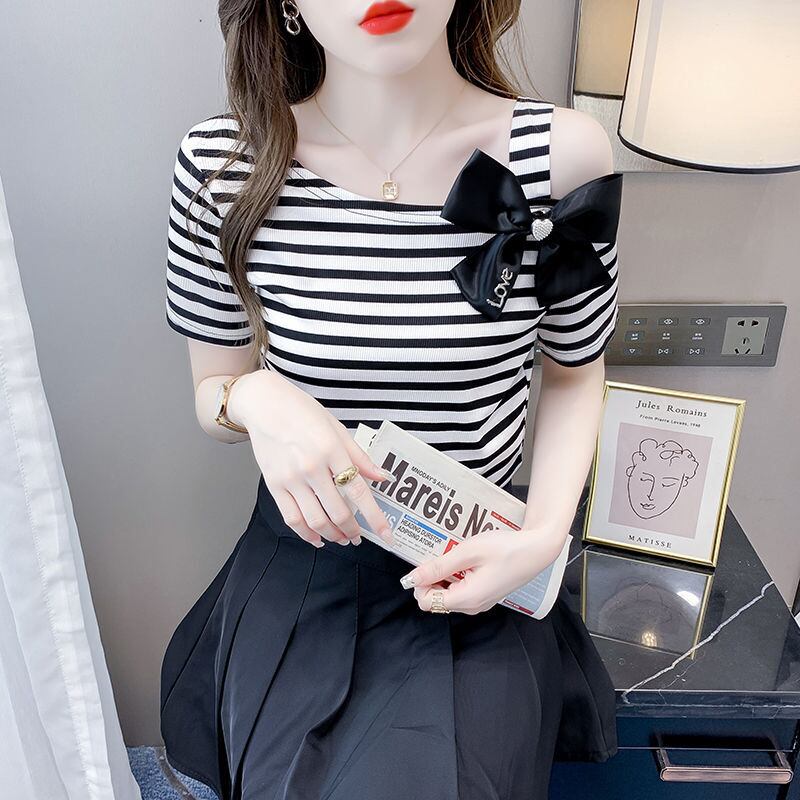 送料無料 プリントスキューカラーリボン中空アウトオフショルダーストライプブラウス女性の 2023 夏トップス甘いシャツ 大人ガーリー スウィート キュート カジュアル サマー 夏物 AE1288776690095173330