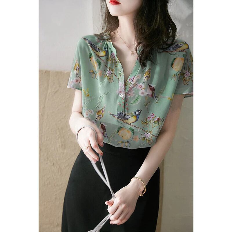 送料無料 V ネックプリント半袖花柄シフォンブラウス女性の 2024 夏ルーズトップスオフィスレディシャツ ショート ハーフスリーブ サマー 夏物 Vネック 会社 学校 通勤や通学にも AE1288776624950654267