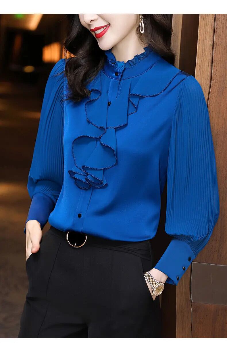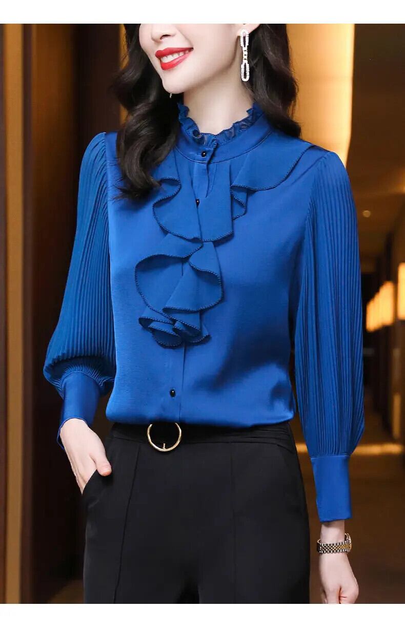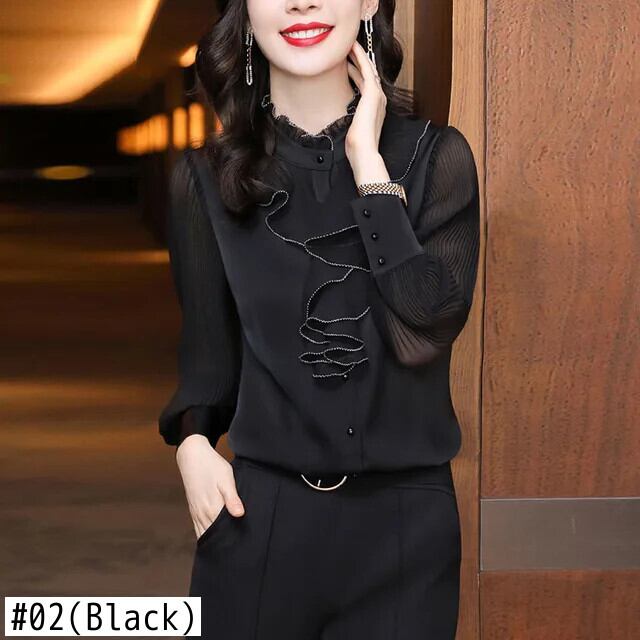 送料無料 スタンドカラーボタン折りフリルシャツレディース春秋トップスオフィスレディブラウス ラッフル スプリング 春物 オータム 秋物 会社 学校 通勤や通学にも AE12887766722208864